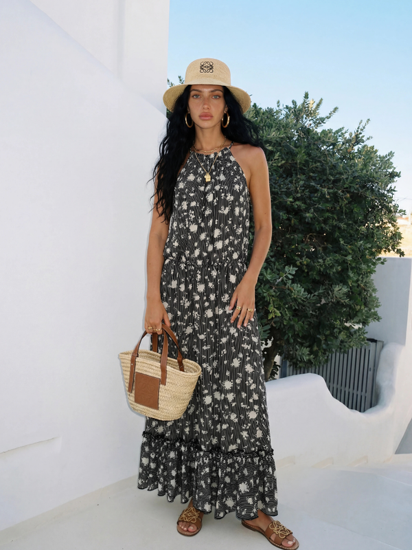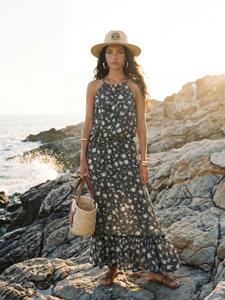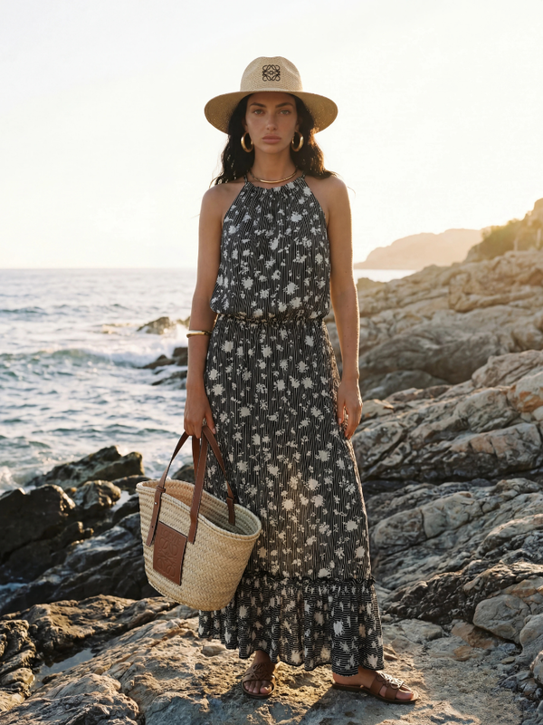 Fantastic Belinda maxi dress, made of high-quality material. There is an adjustable neckline and straps at the top. The drawstring at the waist beautifully highlights the figure. There is a lining underneath. Polish producer Cocomore. Product presentation uses AI visualization.