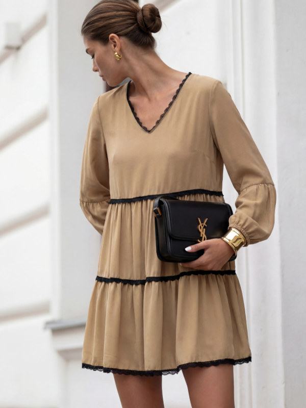The Hazmona dress is an oversized dress with a V-neckline. Contrasting lace stripes add a unique charm. The dress is finished with puffed sleeves with cuffs. The flared hem is adorned with ruffles. Polish manufacturer Cocomore. Product presentation uses AI visualizations.