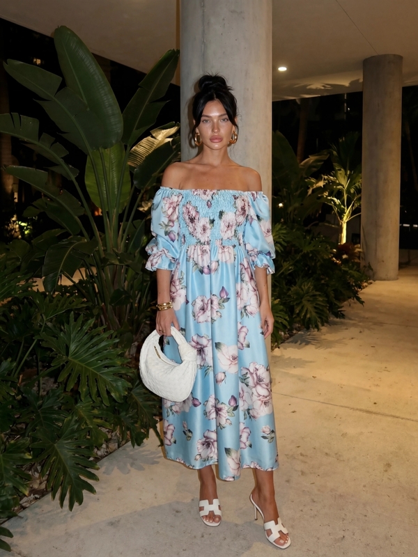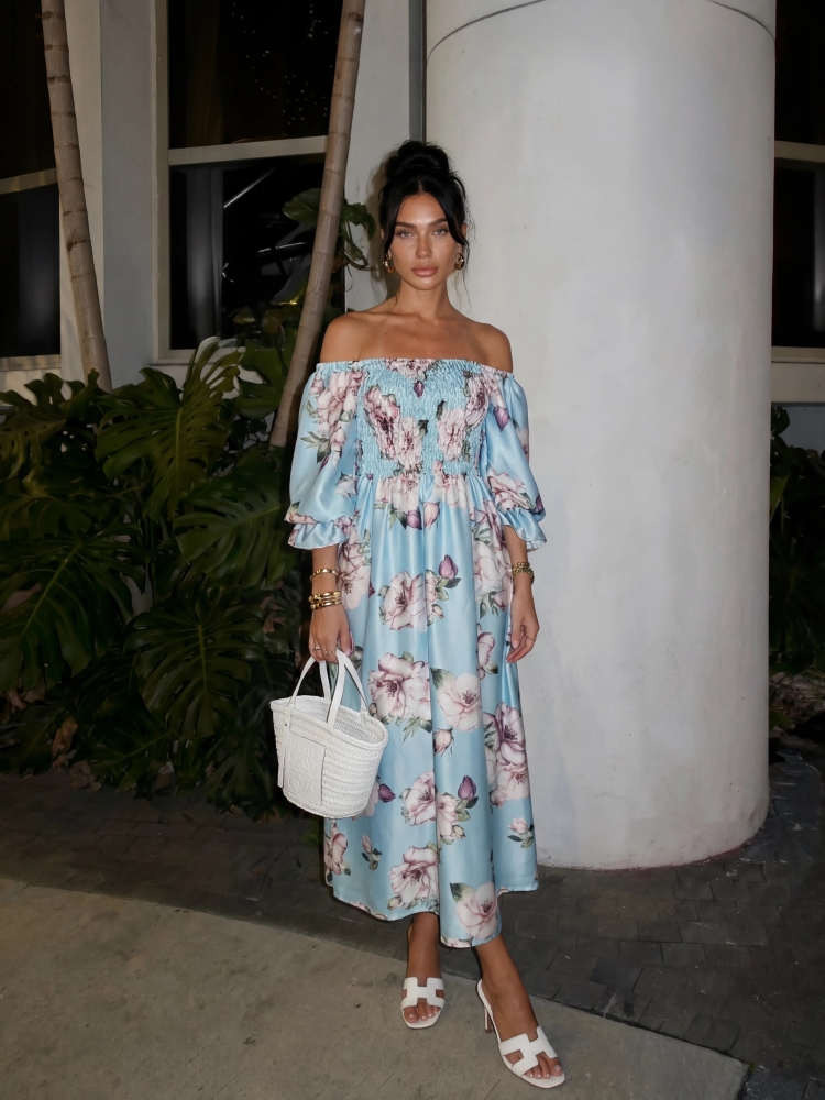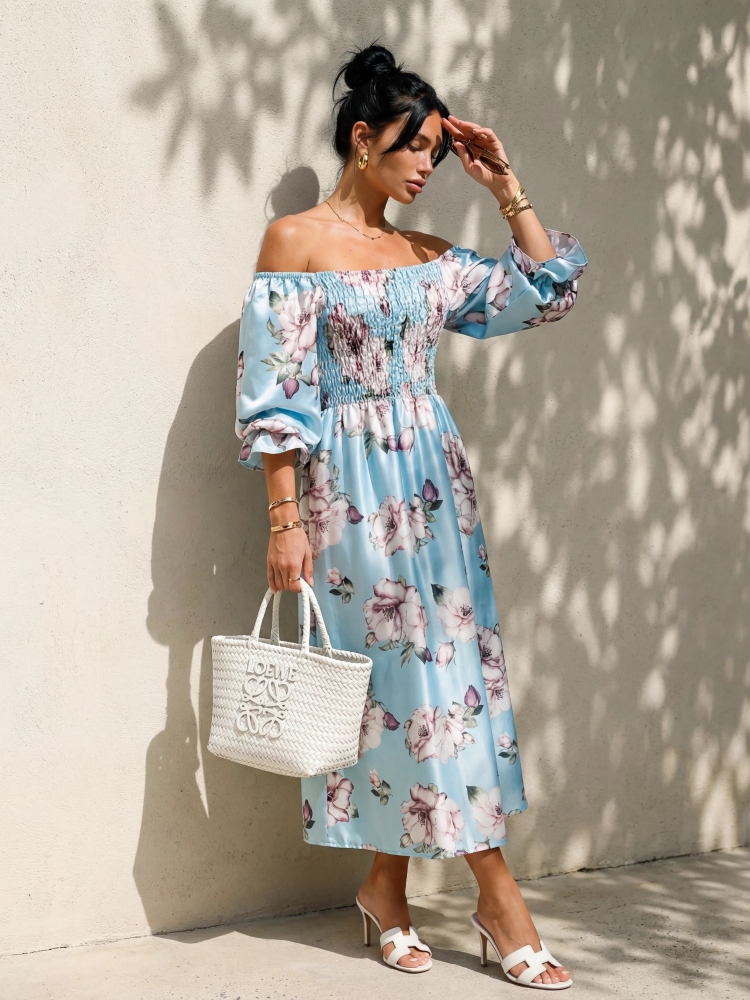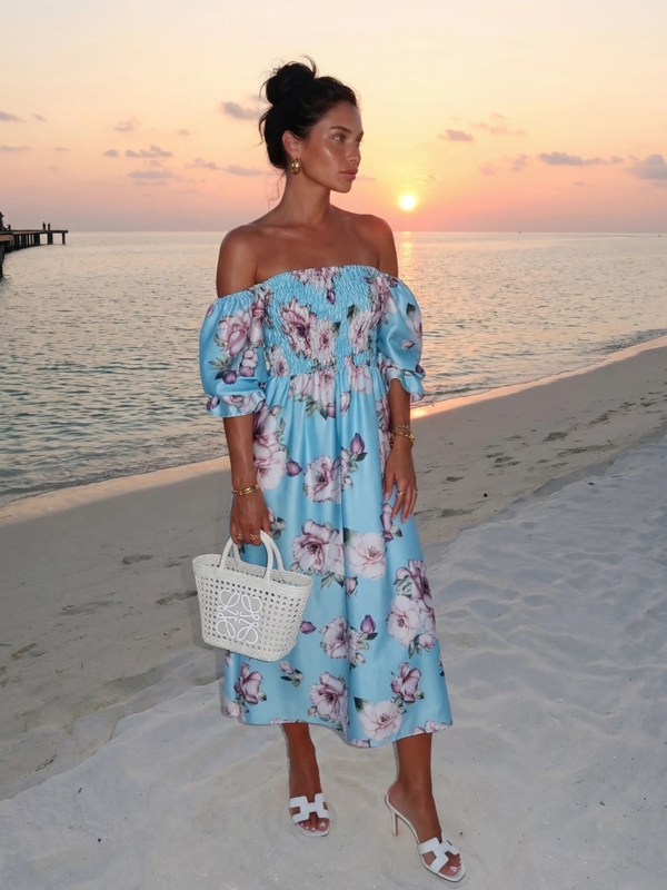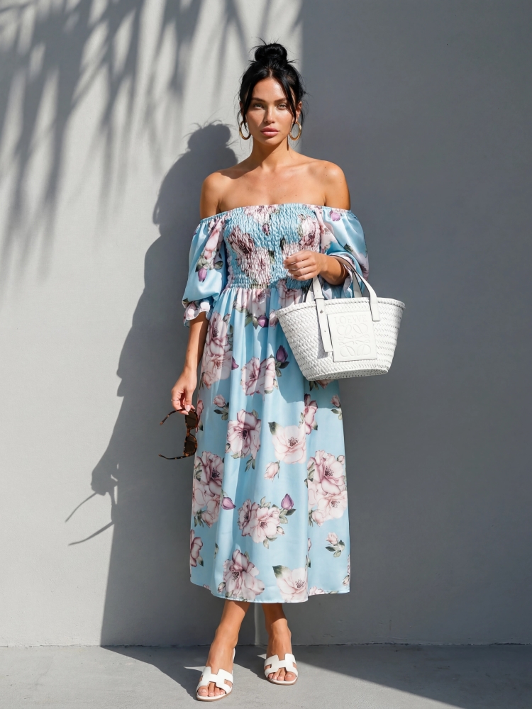 The modern Katinga dress is made of high-quality fabric. It features a unique midi silhouette with a stretchy top, flared skirt, and puffed sleeves for a touch of character. Made in Poland by Cocomore. Product presentation uses AI visualizations.