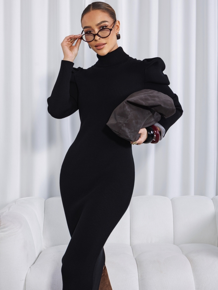 Kendris's fantastic maxi sweater dress is a style perfect for any occasion. The fitted cut is balanced by a subtle slit at the back. The feminine turtleneck and puffed sleeves create a cohesive whole. Polish manufacturer: Cocomore.