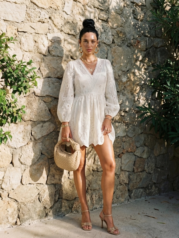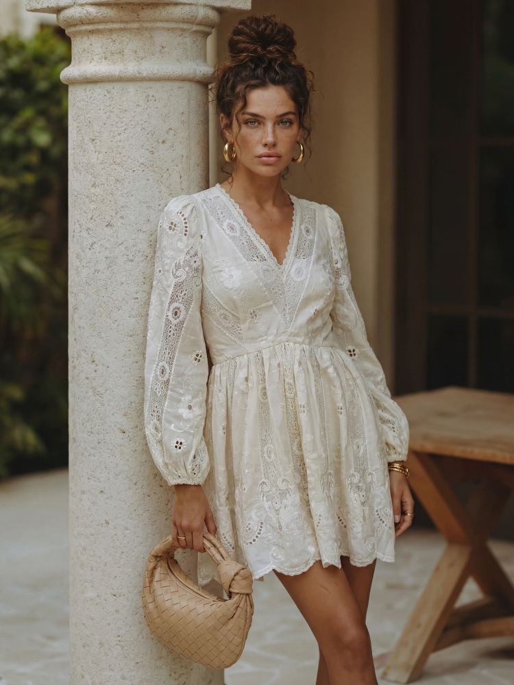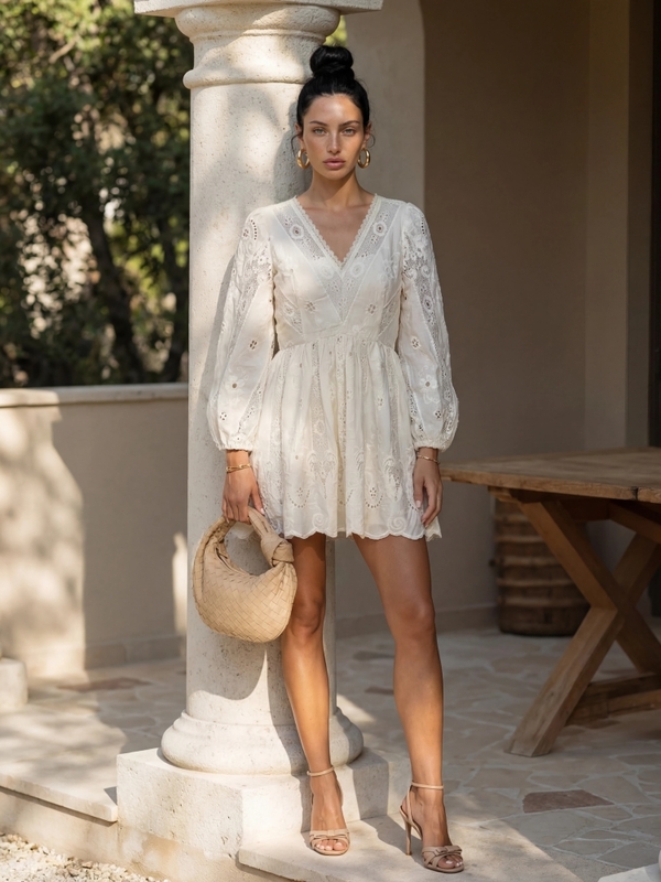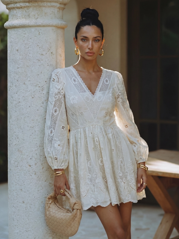 An elegant and feminine dress with a V-neckline that subtly enhances the silhouette. The sleeves finished with elastic cuffs add lightness and comfort. The model features a lining and a back zipper closure for a perfect fit. Ideal for special occasions. The product presentation uses AI-generated visuals.