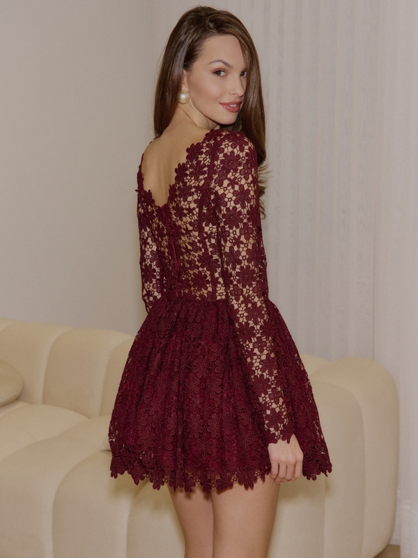 Extremely charming Tallia dress, made of translucent lace material. Fastened with a zipper on the back. The flared, mini-length cut is complemented with lining and tulle. Polish producer Cocomore.