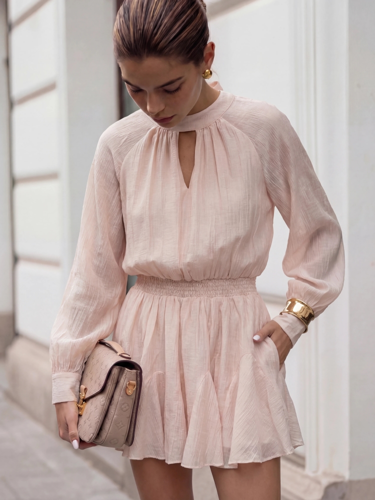 The Thelma dress is a mini-length dress with an incredibly graceful cut that will ensure the perfect styling. The loosely cut top is balanced by a fitted waist. The flared skirt will look beautiful in motion. The puffed sleeves are complemented by buttoned cuffs. There is a subtle slit at the back of the neck finished with a tie. Additionally, the front features a subtle slit at the neckline. This imported product. The product presentation uses AI visualizations.