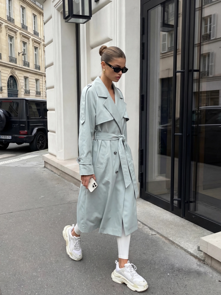 The stunning, oversized Richard coat is a must-have this season. Its wide cut is balanced by a waist tie. It fastens with double-breasted buttons, adding a touch of charm. The shoulders are also adorned with epaulets and shoulder pads for a perfect fit. Decorative stitching is featured on the sleeves. Practical pockets are located on the sides. A subtle slit adorns the back. Produced by Cocomore. Product presentation uses AI visualizations.