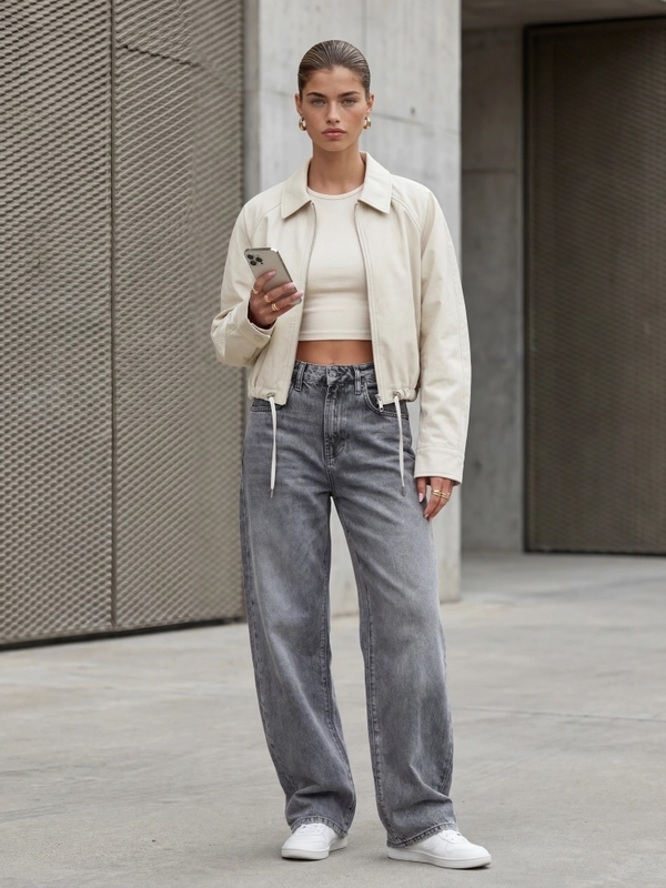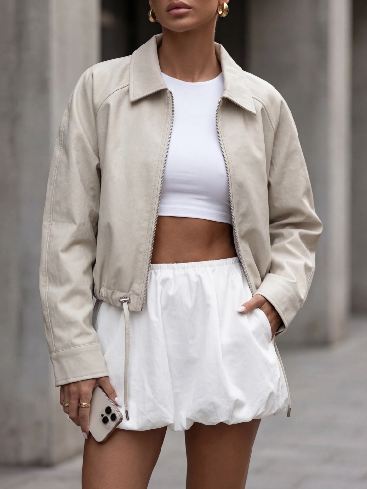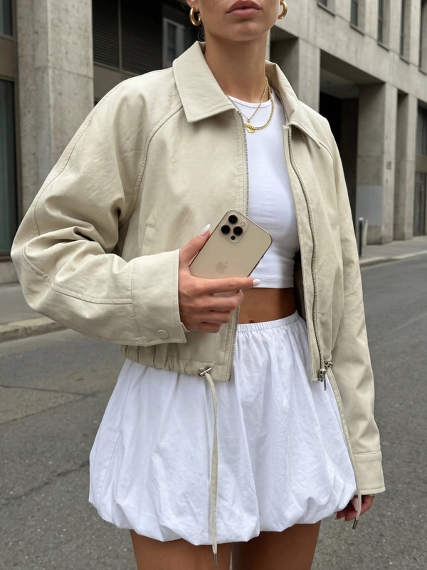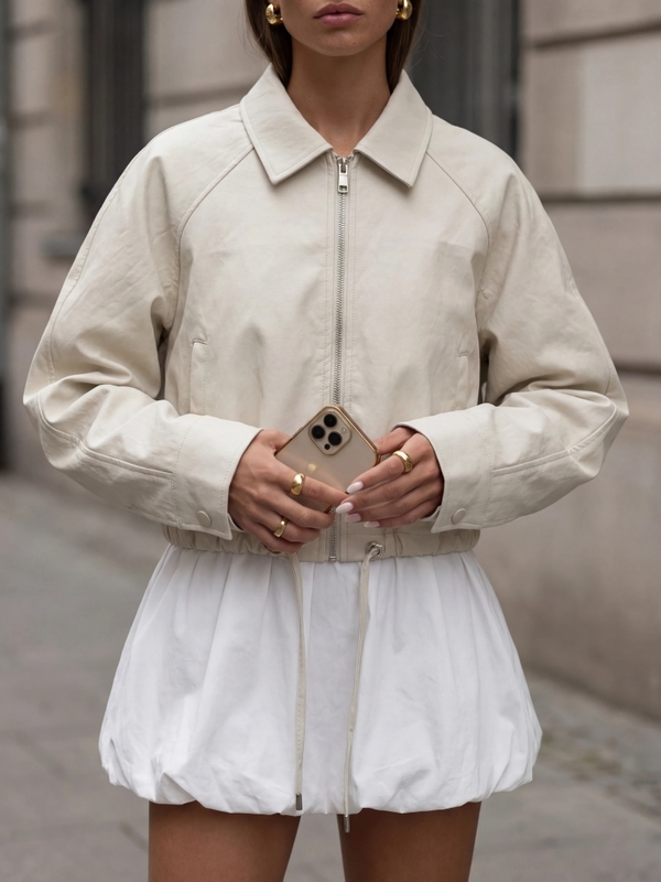The Lavender jacket is an elegant, loose-fitting biker jacket made of eco-leather. It fastens with a practical zipper. There are practical pockets on the sides. A drawstring at the bottom allows for width adjustment. This imported product is presented using AI visualizations.