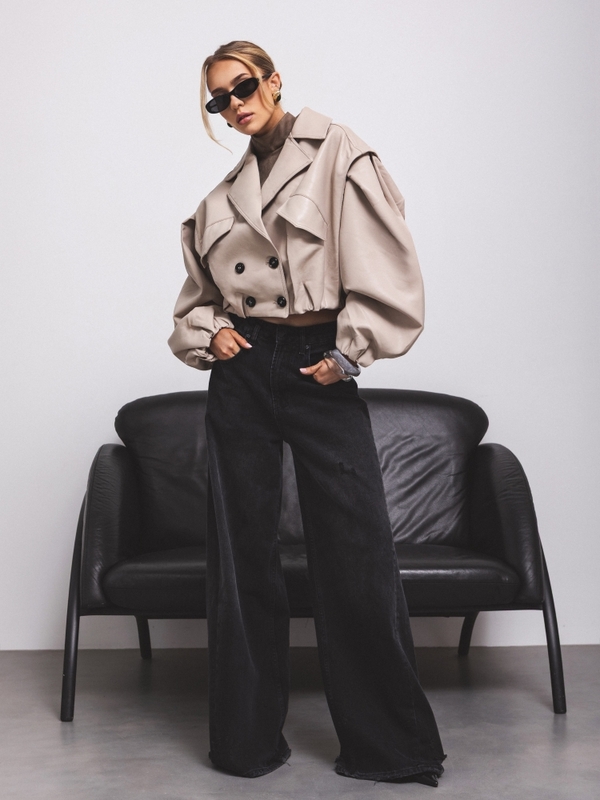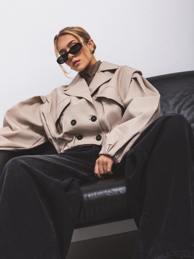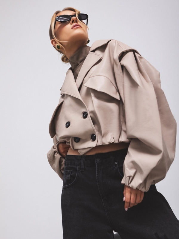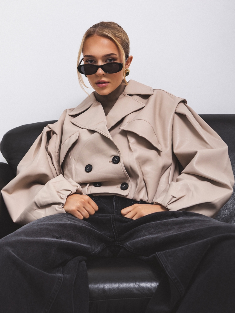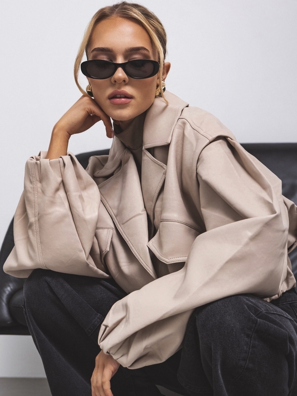 The Rachel jacket is a short, loose-fitting jacket made of eco-leather. It is lined and features a wide collar that perfectly complements the overall look. It fastens with double-breasted buttons. Practical pockets are located on the sides. Additionally, the cuffs feature drawstrings for adjusting the length to your needs. Decorative stitching on the shoulders completes the look. Made by Polish manufacturer Cocmore.