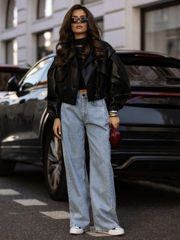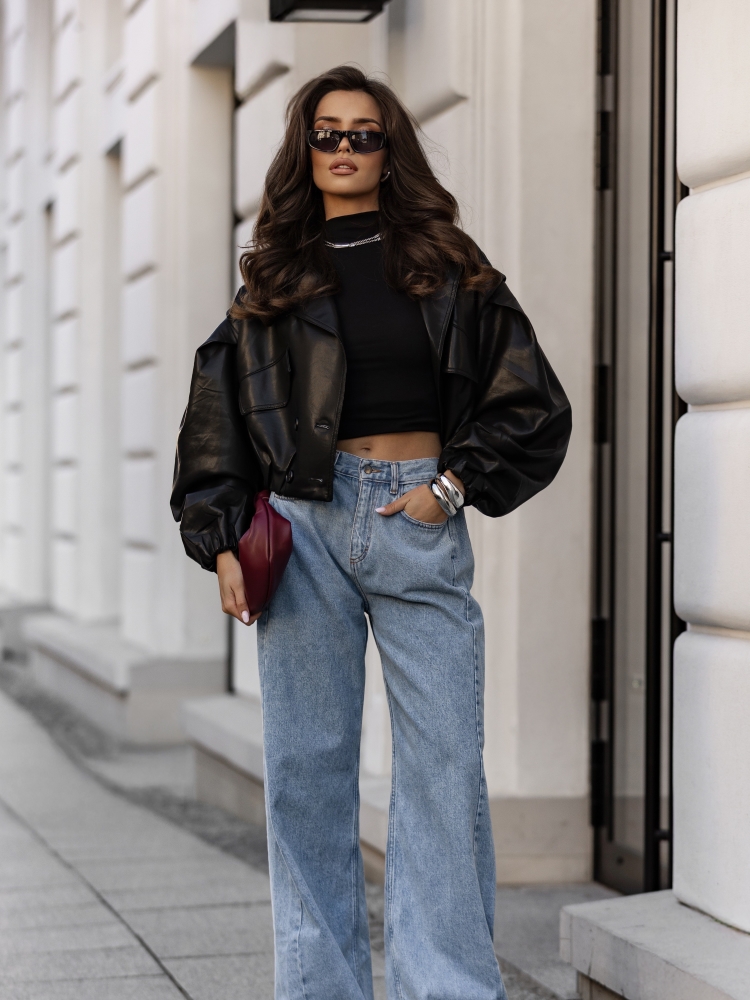 The Rachel jacket is a short, loose-fitting jacket made of eco-leather. It is lined and features a wide collar that perfectly complements the overall look. It fastens with double-breasted buttons. Practical pockets are located on the sides. Additionally, the cuffs feature drawstrings for adjusting the length to your needs. Decorative stitching on the shoulders completes the look. Made by Polish manufacturer Cocmore.