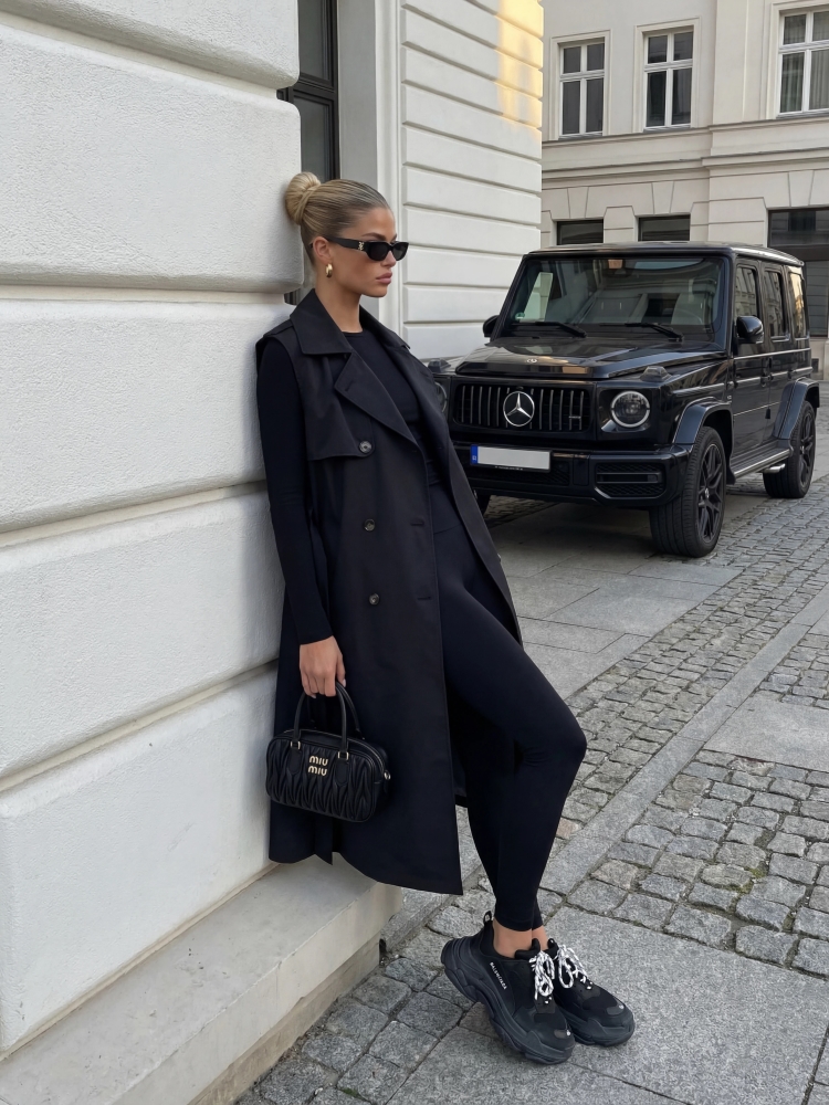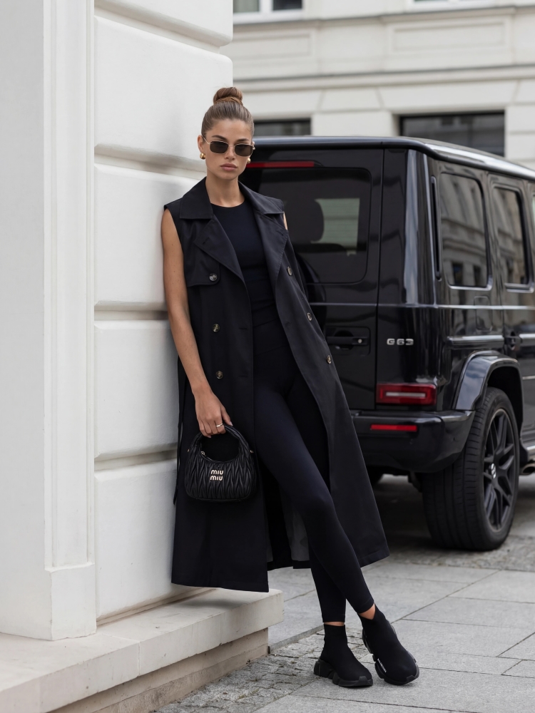 The unique Maury vest features an asymmetrical length that visually elongates the silhouette. The wide cut ensures comfort, while the waist ties allow for a tailored fit. It fastens with striking, double-breasted buttons. It also features practical side pockets. Produced by Polish company Cocomore. Product presentation uses AI visualizations.