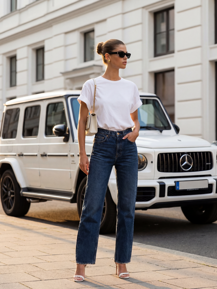 Dover wide leg denim trousers are the most fashionable proposition this season. Fastened with a practical zipper and button. They have numerous pockets and belt loops at the waist. The high waist will perfectly emphasize the waist. Belt included. Producer Cocomore. Product presentation uses AI visualizations.