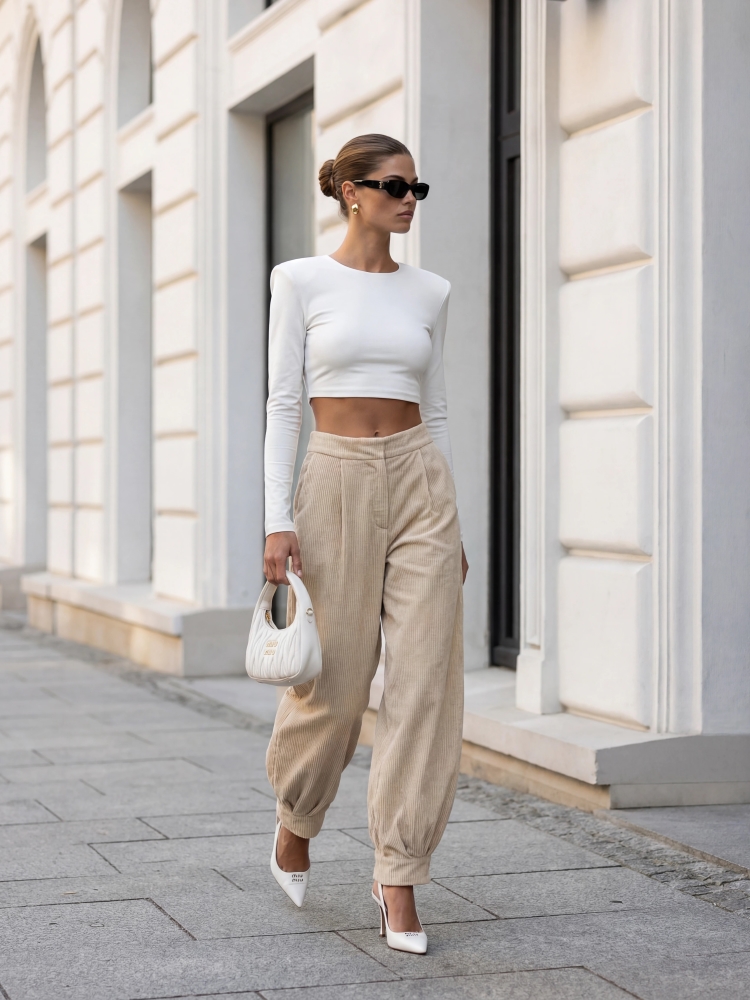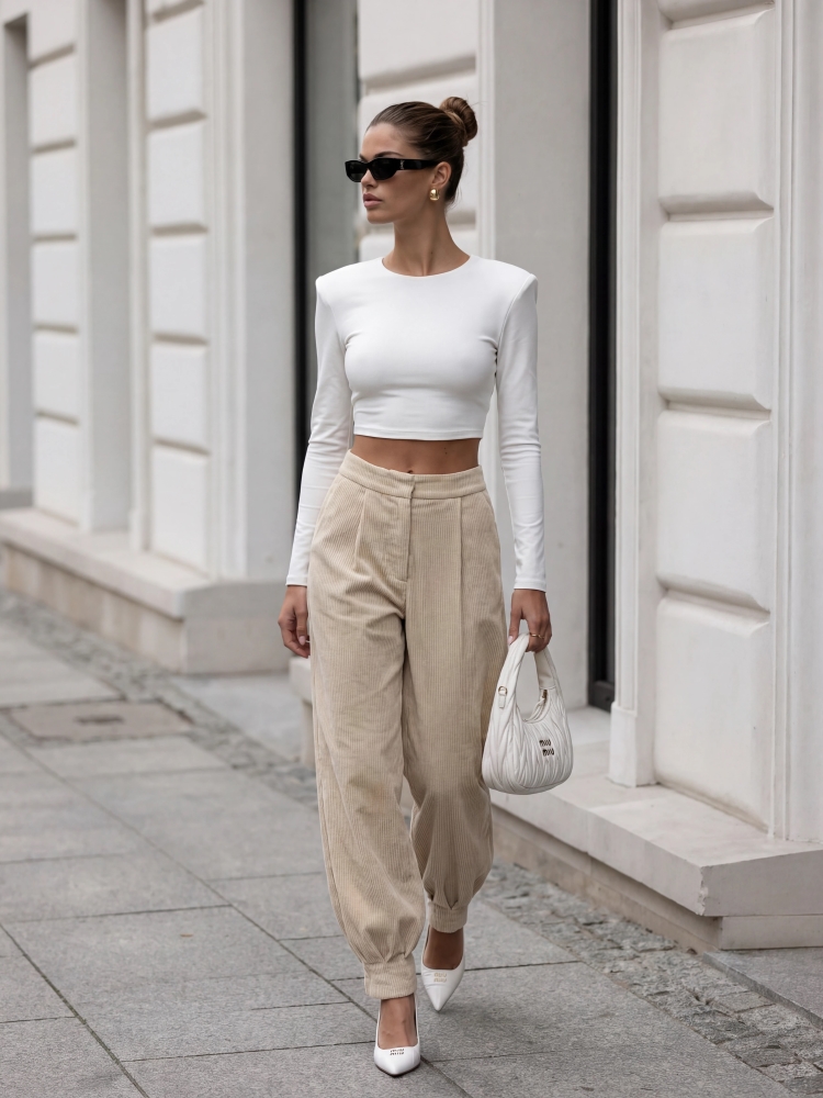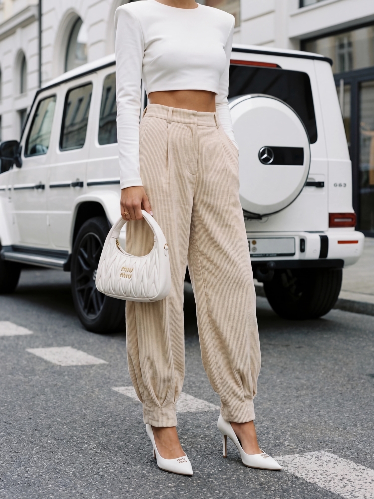 Modern Gazmond trousers made of high-quality corduroy. The design is distinguished by elegantly cut legs, a high waist, and a two-button zipper closure. Additionally, there are practical pockets on the sides. Polish manufacturer Cocomore. The product presentation uses AI visualizations.