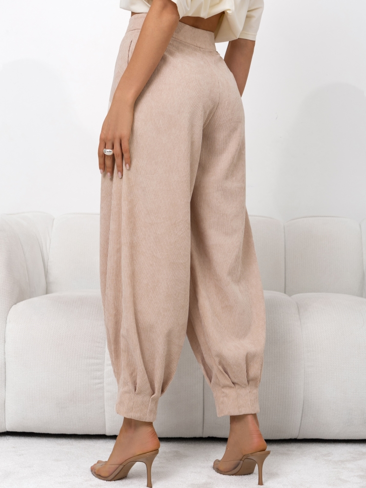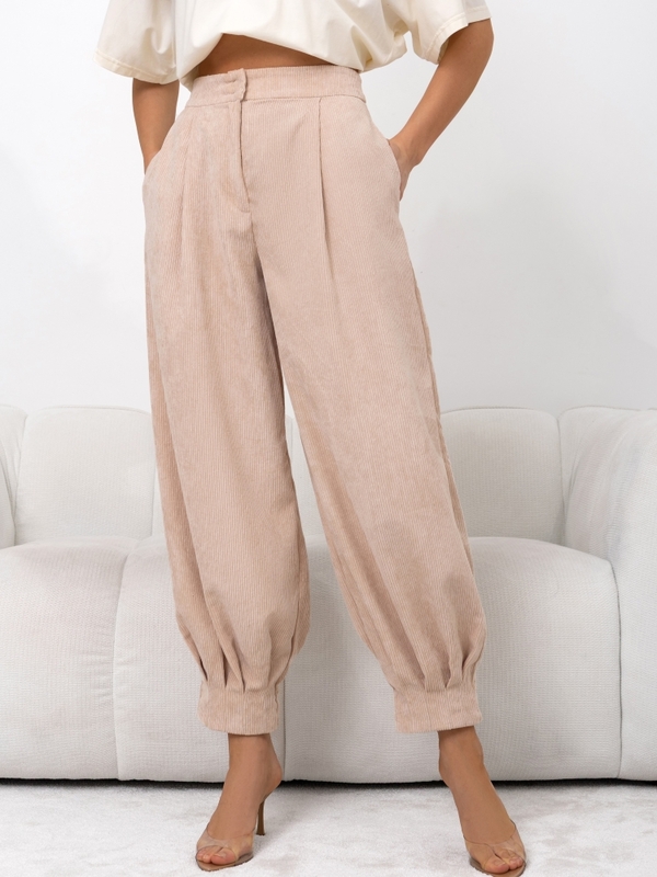 Modern Gazmond trousers made of high-quality corduroy. The design is distinguished by elegantly cut legs, a high waist, and a two-button zipper closure. Additionally, there are practical pockets on the sides. Polish manufacturer Cocomore.