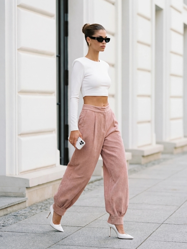Modern Gazmond trousers made of high-quality corduroy. The design is distinguished by elegantly cut legs, a high waist, and a two-button zipper closure. Additionally, there are practical pockets on the sides. Polish manufacturer Cocomore. The product presentation uses AI visualizations.
