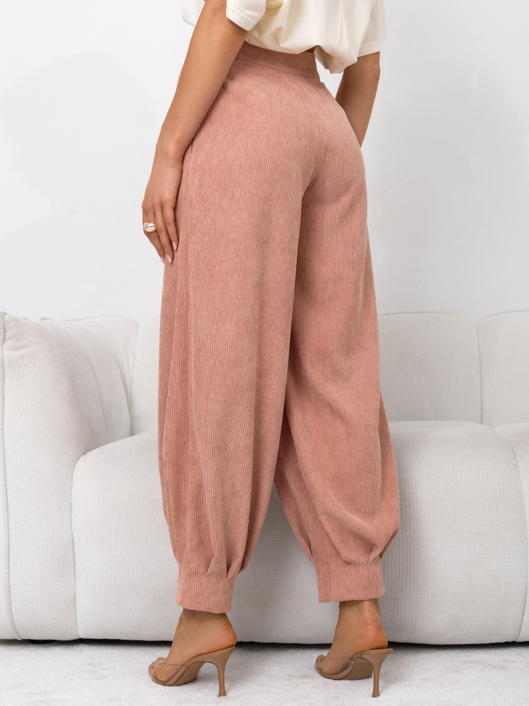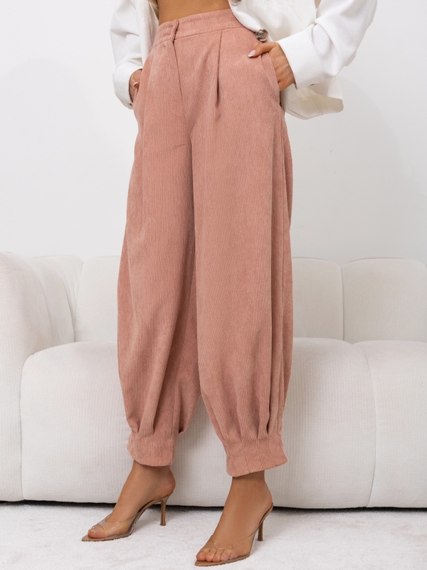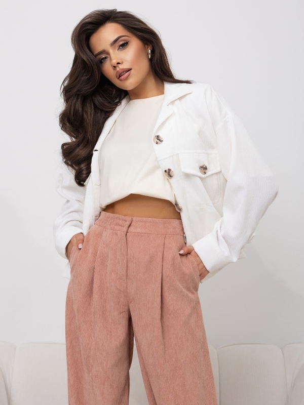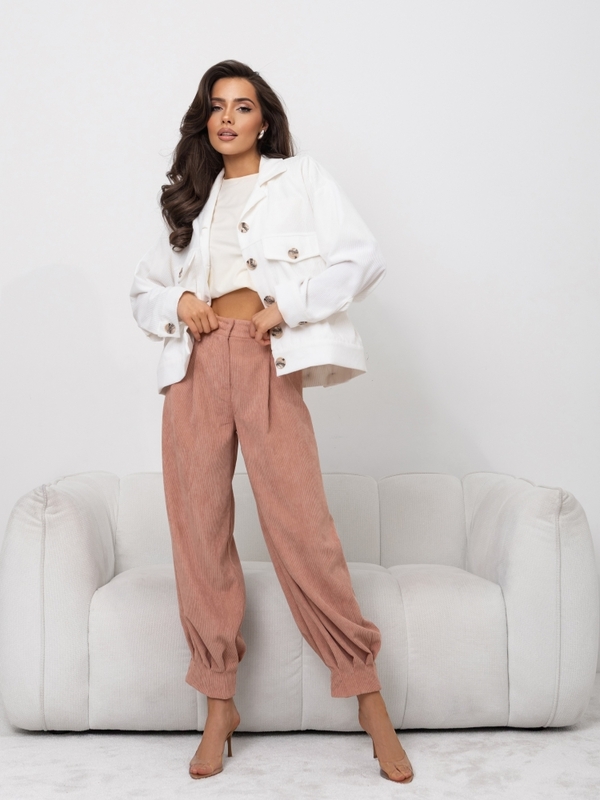 Modern Gazmond trousers made of high-quality corduroy. The design is distinguished by elegantly cut legs, a high waist, and a two-button zipper closure. Additionally, there are practical pockets on the sides. Polish manufacturer Cocomore.
