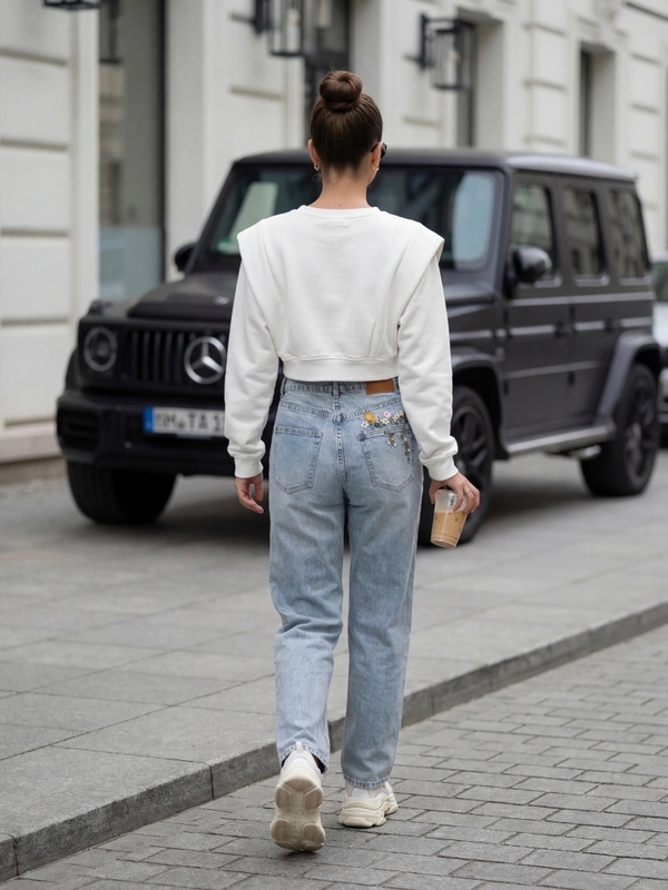 Leoniden's mom fit jeans are a perfect base for a variety of outfits. The high waist and belt loops accentuate the silhouette. Numerous side pockets are located on the sides. They fasten with a zip and button. The back features contrasting floral embroidery complemented by shimmering sequins and beads. This imported product uses AI visualizations.