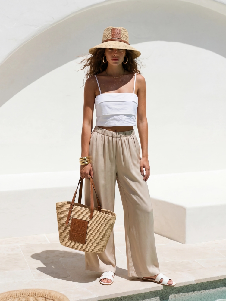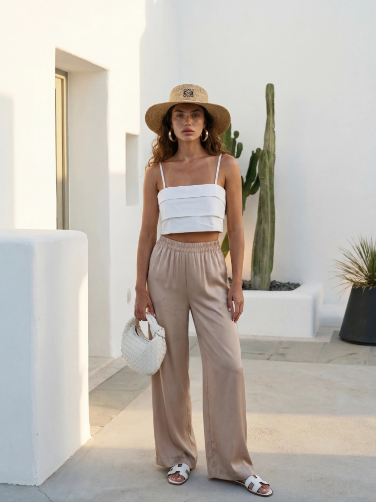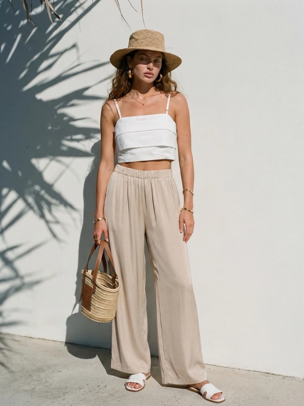 The Lorcan trousers are a unique, wide-leg design made of high-quality fabric. Their high waist and elastic waistband accentuate the silhouette. They also feature side pockets. From the Polish manufacturer Cococmore. The product presentation uses AI visualizations.