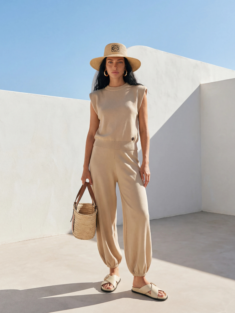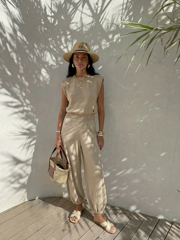 These unique Perrin sweater trousers are made of high-quality yarn. Wide, loose legs are offset by ribbed cuffs. The high waist and elastic waistband accentuate the silhouette. They look great paired with the sweater of the same name. Made by Polish manufacturer Cocomore.Product presentation uses AI visualizations.