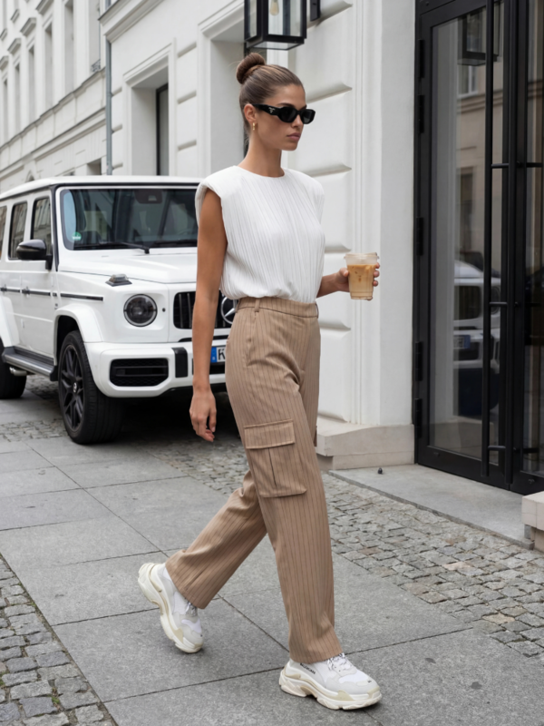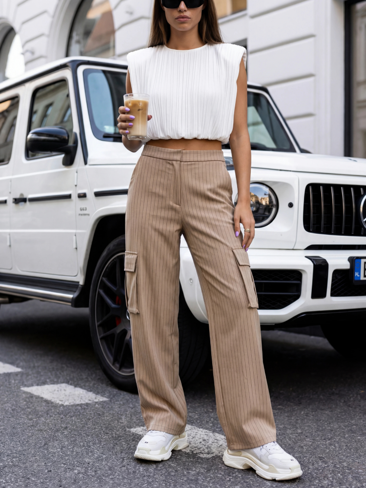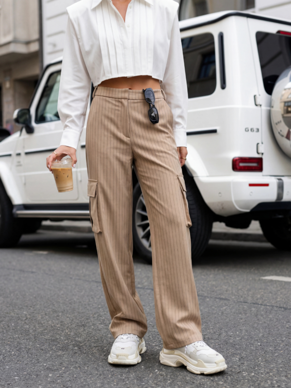 Remos pants are made of high-quality material, have a loose cut and high waist. They are fastened with a zipper and snap. There are belt loops at the waist and a drawstring at the back. They have practical pockets on the sides and imitation pockets on the buttocks. Wide legs give them character. Caven trousers are a combination of comfort and style. Polish producer Cocomore.  Product presentation uses AI visualizations.