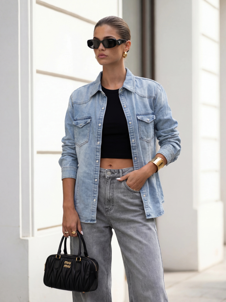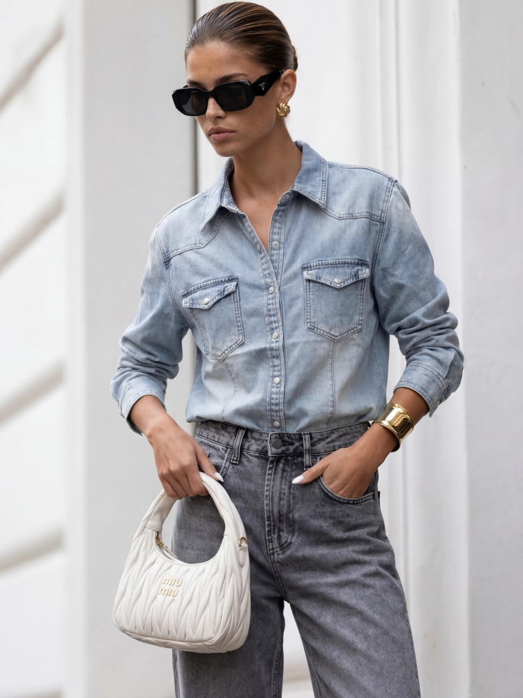The brilliant, fitted Mallory shirt offers a multitude of styling options. The asymmetrical length visually slims the silhouette. Crafted from high-quality denim, the front is adorned with flap pockets. Polish manufacturer Cocomore. Product presentation uses AI visualizations.