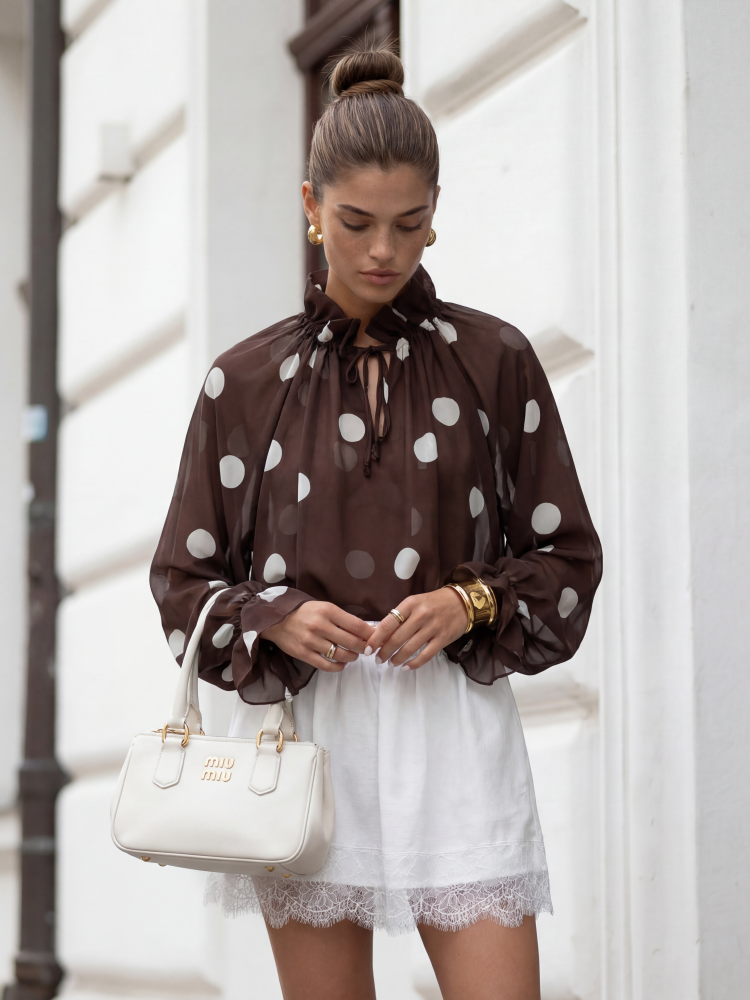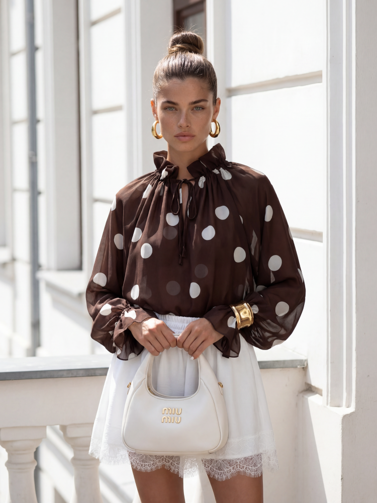 A beautiful, airy Samira shirt, made of high-quality fabric. The loose fit ensures comfort and convenience. Additional features include ruching and ties at the top, as well as cuffs for adjustable length. Made in Poland. Manufacturer: Cocomore. Product presentation uses AI visualizations.