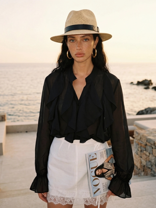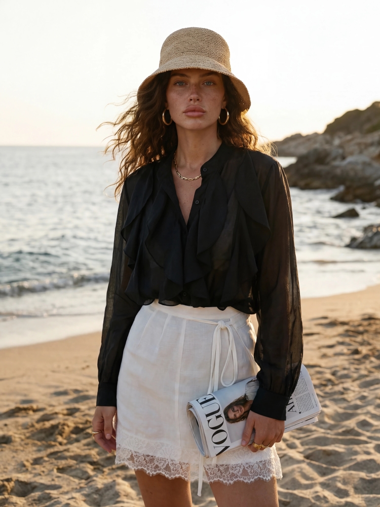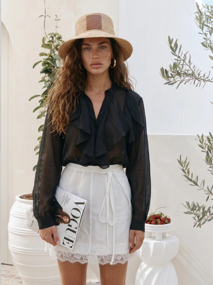 The high-quality Yvonne shirt is a model that will successfully complement many styles. The oversized cut ensures comfort and ease of wearing. It fastens with practical buttons. The ruffles adorning the front add chic and elegance. Polish manufacturer Cocomore. Product presentation uses AI visualizations.