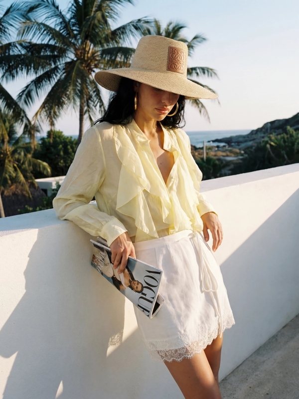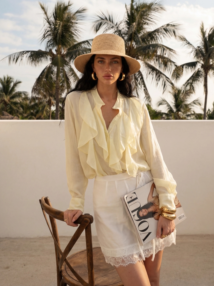 The high-quality Yvonne shirt is a model that will successfully complement many styles. The oversized cut ensures comfort and ease of wearing. It fastens with practical buttons. The ruffles adorning the front add chic and elegance. Polish manufacturer Cocomore. Product presentation uses AI visualizations.