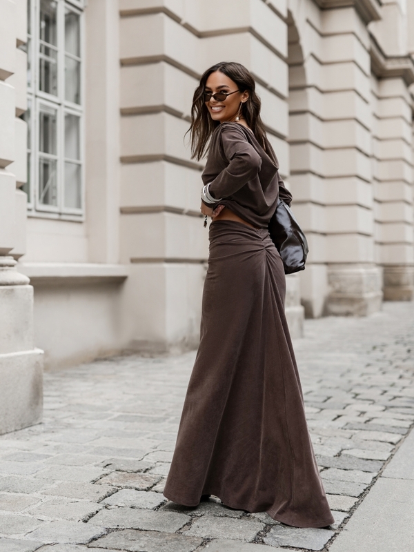 The unique Lawton skirt, crafted from high-quality fabric, pairs beautifully with the blouse of the same name. The trapezoidal, flared cut is balanced by a drawstring waist. Ruching at the front and back enhances the look. Made by Polish manufacturer Cocomore.