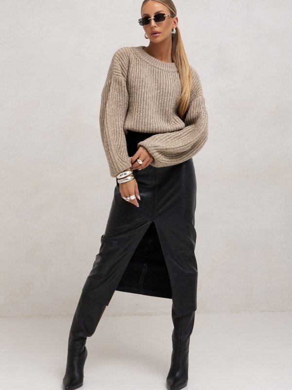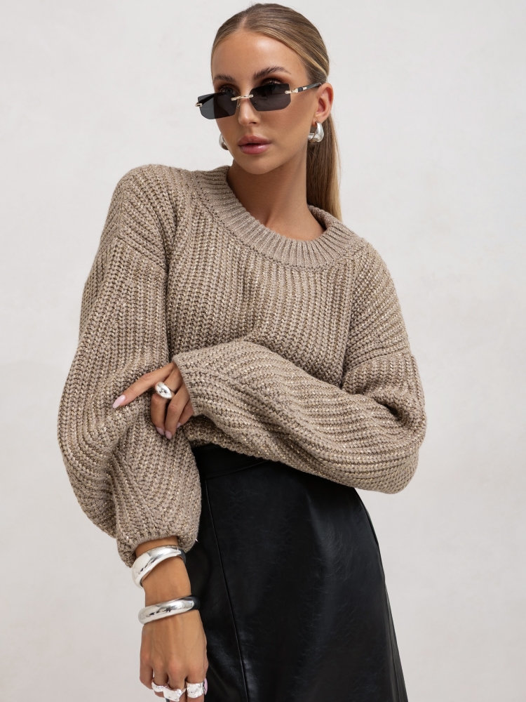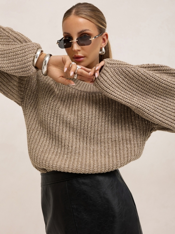 The striking, shiny Barella sweater is a great addition to many basic outfits this season. Wide, fashionable sleeves and a touch of silver thread add a touch of chic. The cut allows you to pair it with a skirt, classic jeans, and a biker jacket. Made in Poland.