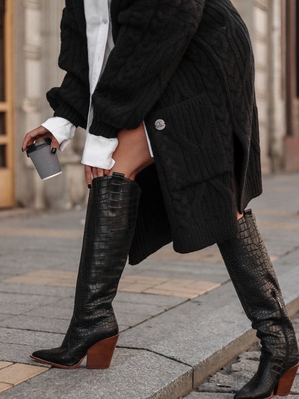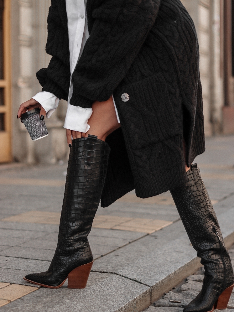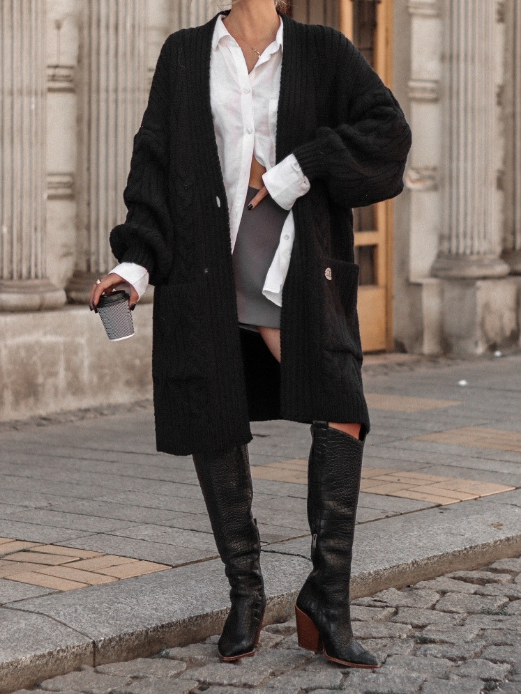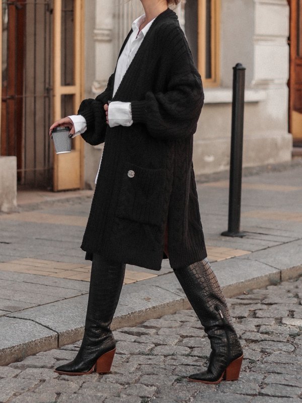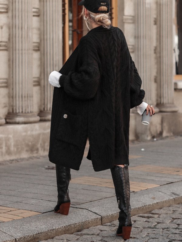 The Agathie sweater is a perfect combination of style and comfort. Medium-length cardigan, fastened with one button. The sleeves are finished with welts. The front part of the sweater is decorated with two capacious pockets that add practicality. The characteristic braid weave gives it a unique look, and the slits on the sides allow free movement. There is a manufacturer's patch on one of the pockets. Made in Poland.