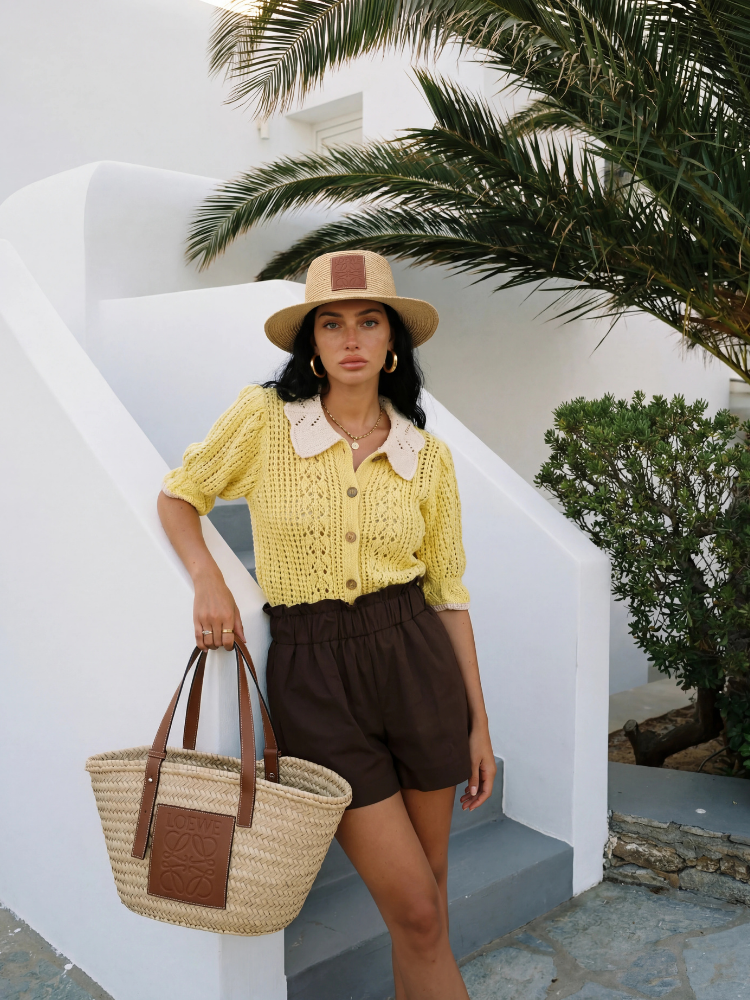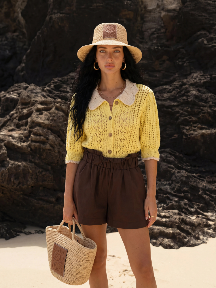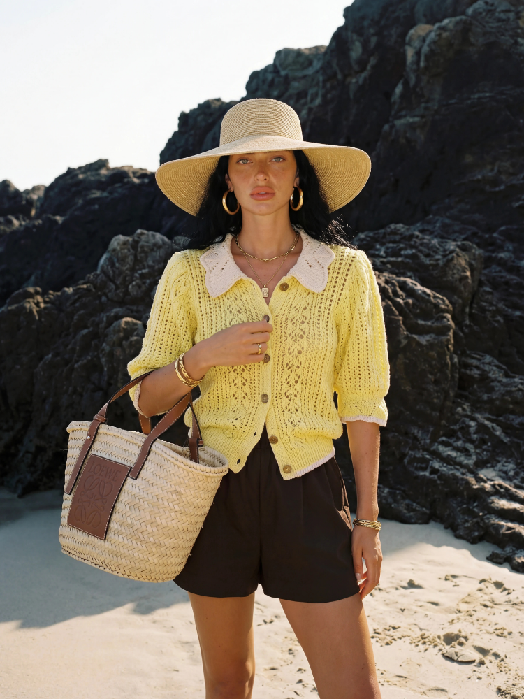 The Angus sweater is a truly feminine piece with an openwork weave, making it a perfect alternative to a classic blouse. The cardigan's cut offers numerous styling options. Puffed sleeves with a contrasting stripe add charm. A decorative collar completes the look. Polish manufacturer Cocomore. The product presentation uses AI visualizations.