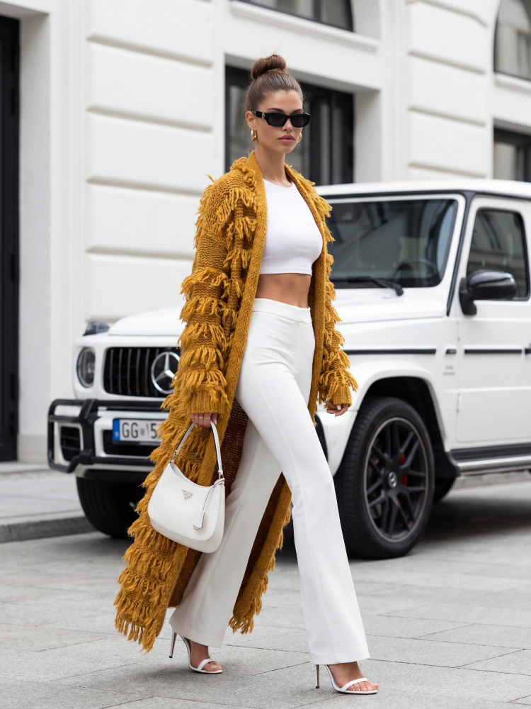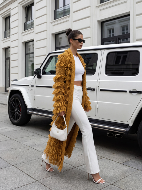 A modern Bohemian cardigan, made of soft-touch yarn. Decorative fringes and practical pockets enhance the design. It's a perfect alternative to a classic jacket or coat in the off-season. Made in Poland. Manufacturer: Cocomore. Product presentation uses AI visualizations.