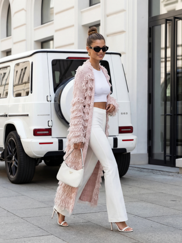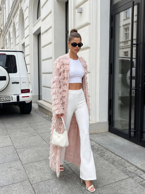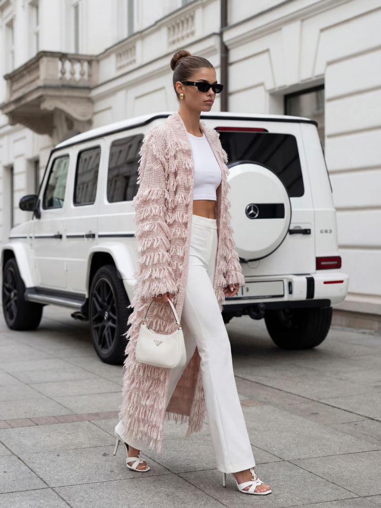 A modern Bohemian cardigan, made of soft-touch yarn. Decorative fringes and practical pockets enhance the design. It's a perfect alternative to a classic jacket or coat in the off-season. Made in Poland. Manufacturer: Cocomore. Product presentation uses AI visualizations.