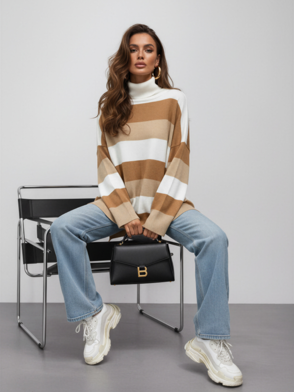 A fantastic Coleen sweater with a timeless striped print. Made from high-quality yarn, it features a versatile turtleneck at the top. An additional advantage is the asymmetric length, which visually slims the figure, and the brand's patch on the side. Polish manufacturer: Cocomore.