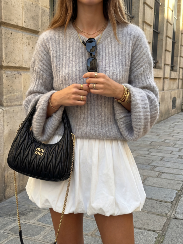A brilliant Cornelius sweater, made of thick, fleshy yarn. The short cut is emphasized by the drawstring located at the very bottom. Its characteristic element are flared sleeves, which give it a unique look. Polish producer Yarn. Product presentation uses AI visualizations.