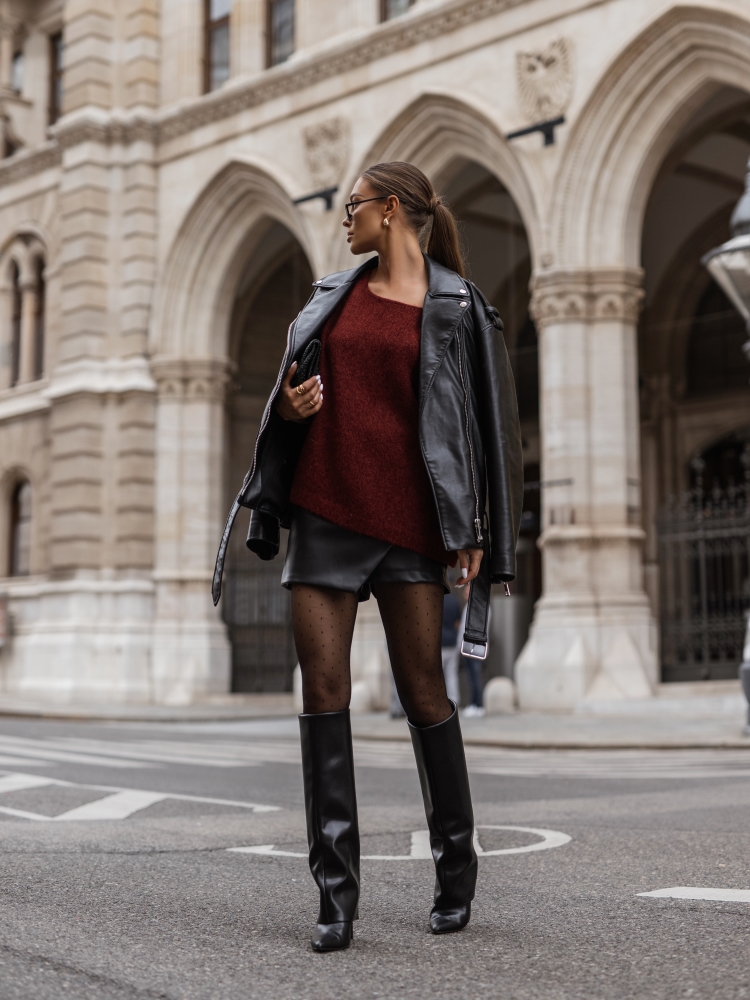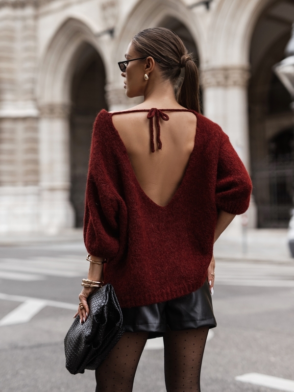 The Darlen sweater is crafted with meticulous attention to detail from high-quality yarn. Short, puffy sleeves are finished with subtle cuffs. A cutout at the back, complemented by a striking tie, adds a unique touch. Made by Polish manufacturer Yarn Studio.