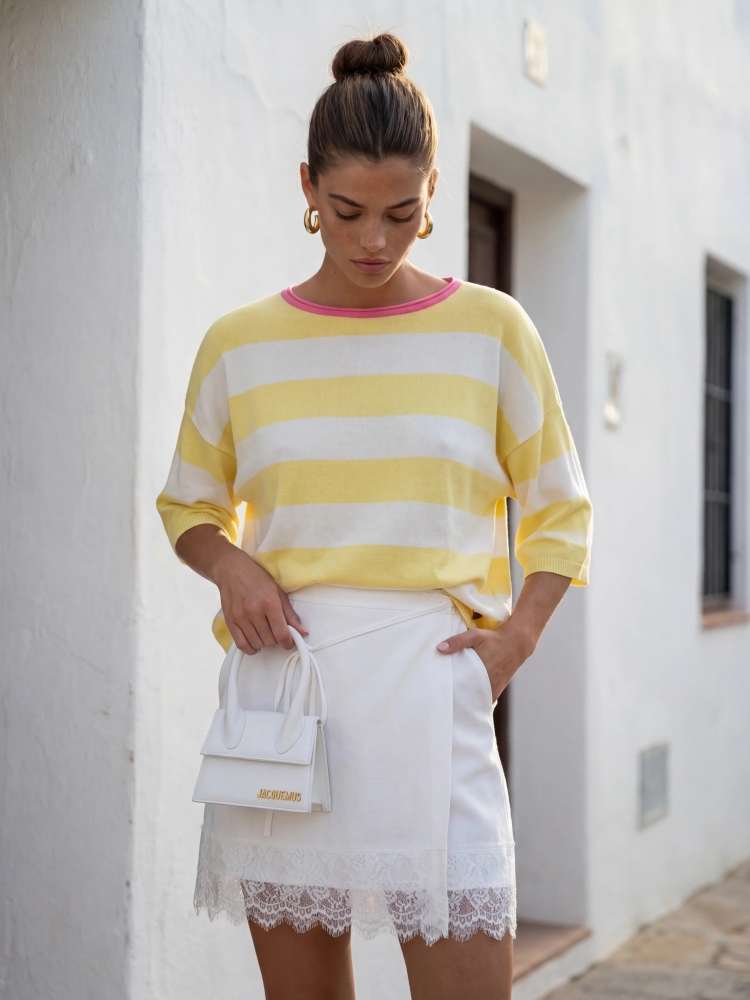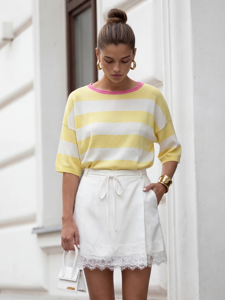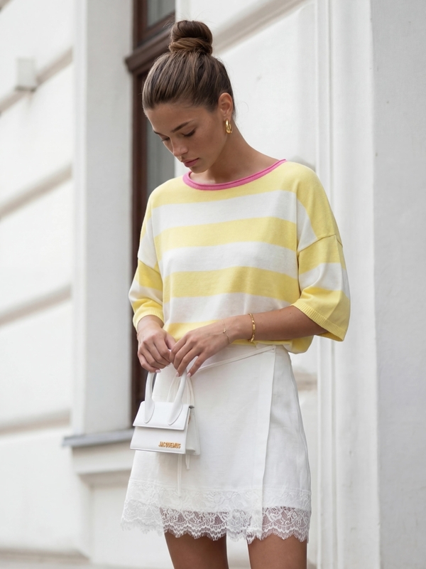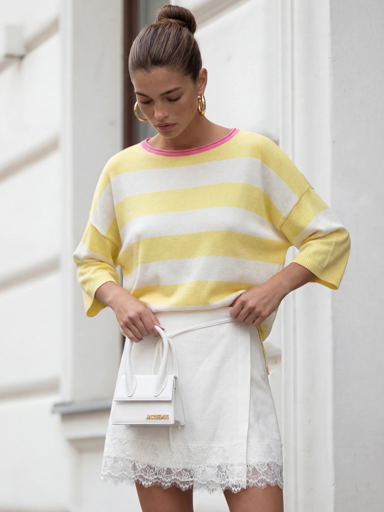 The Emilio sweater is a great choice for women who value comfort and a fashionable look. The oversized cut allows for freedom of movement, while the striped print adds a stylish touch. The sweater features a round neckline and ribbed cuffs. Made in Poland. The product presentation uses AI visualizations.
