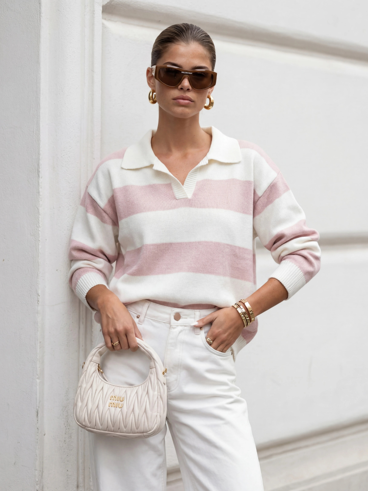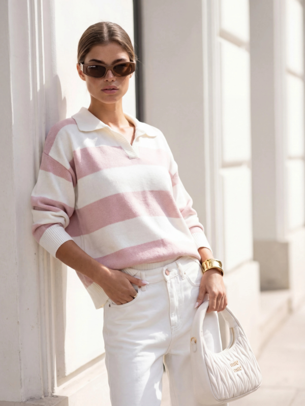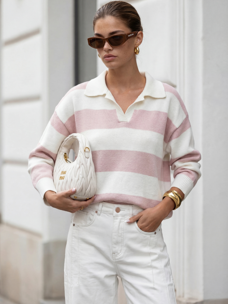 The Ernie sweater is an elegant and comfortable V-neck sweater with a wide collar that falls over the shoulders, giving it a unique look. Ribbing on the shoulders adds a stylish finish. Made from stretchy yarn, it allows for freedom of movement. It's a perfect choice for those who value both elegance and comfort in their clothing. Product presentation uses AI visualizations.