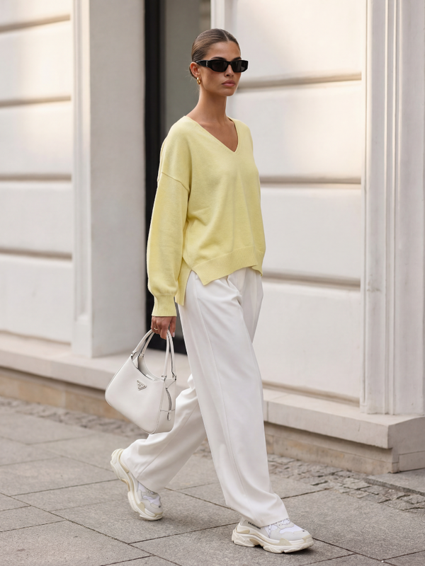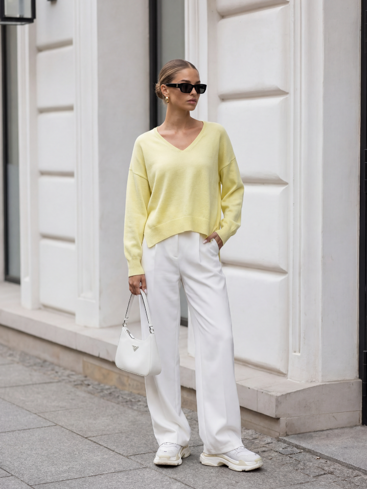 Unique, loose Flynn sweater, made of high quality yarn. A feminine V-neckline adds character. An additional advantage is a badge on the side and delicate welts on the trim. Made in Poland. Product presentation uses AI visualizations.