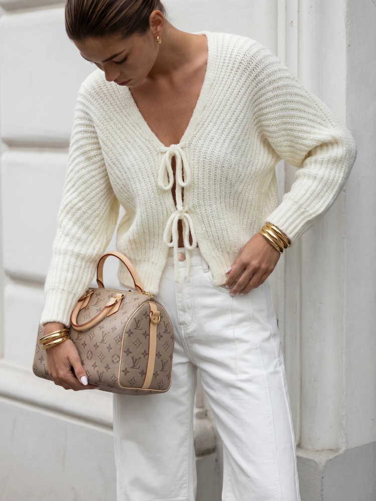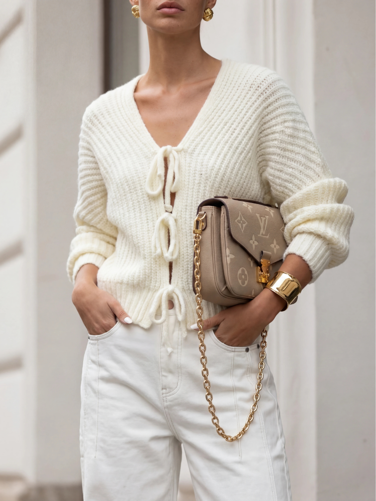 The Grover sweater is a timeless, cropped design adorned with ties at the front. Its feminine V-neckline and ribbed trims accentuate the figure. It will be a perfect addition to any outfit in the upcoming season. From the Polish manufacturer Cocomore. The product presentation uses AI visualizations.