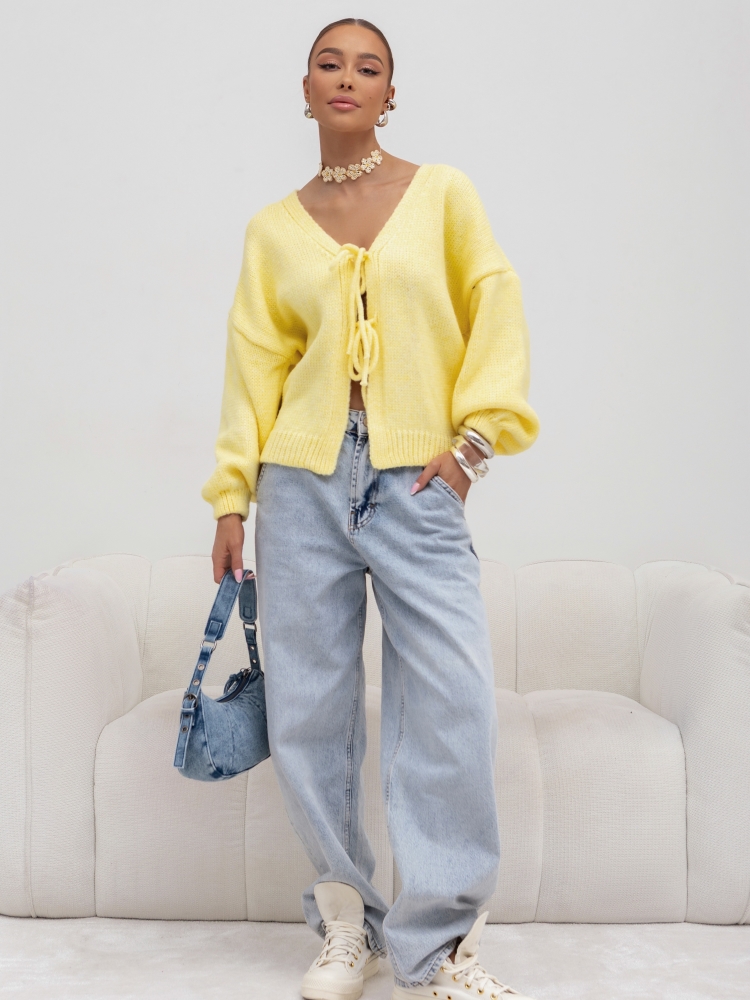 The Herald sweater is a short-cut cardigan adorned with ties at the front. A feminine V-neckline and ribbed cuffs accentuate the figure. The design is completed with wide sleeves finished with ribbed cuffs. Polish manufacturer: Cocomore.