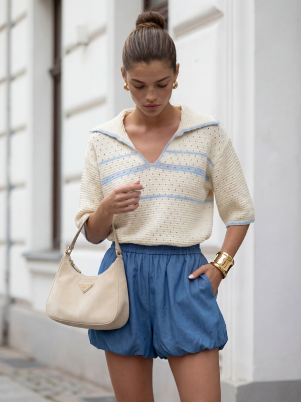 A timeless Kendrick sweater made of high-quality yarn with an openwork weave. Contrasting stripes and a ribbed hem add a touch of elegance. The polo cut is enhanced by a wide collar that falls freely over the shoulders. A versatile, unique option for many styles. Made in Poland. Produced by Yarn Studio. Product presentation uses AI visualizations.