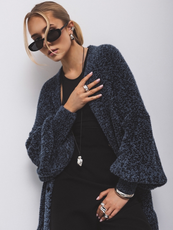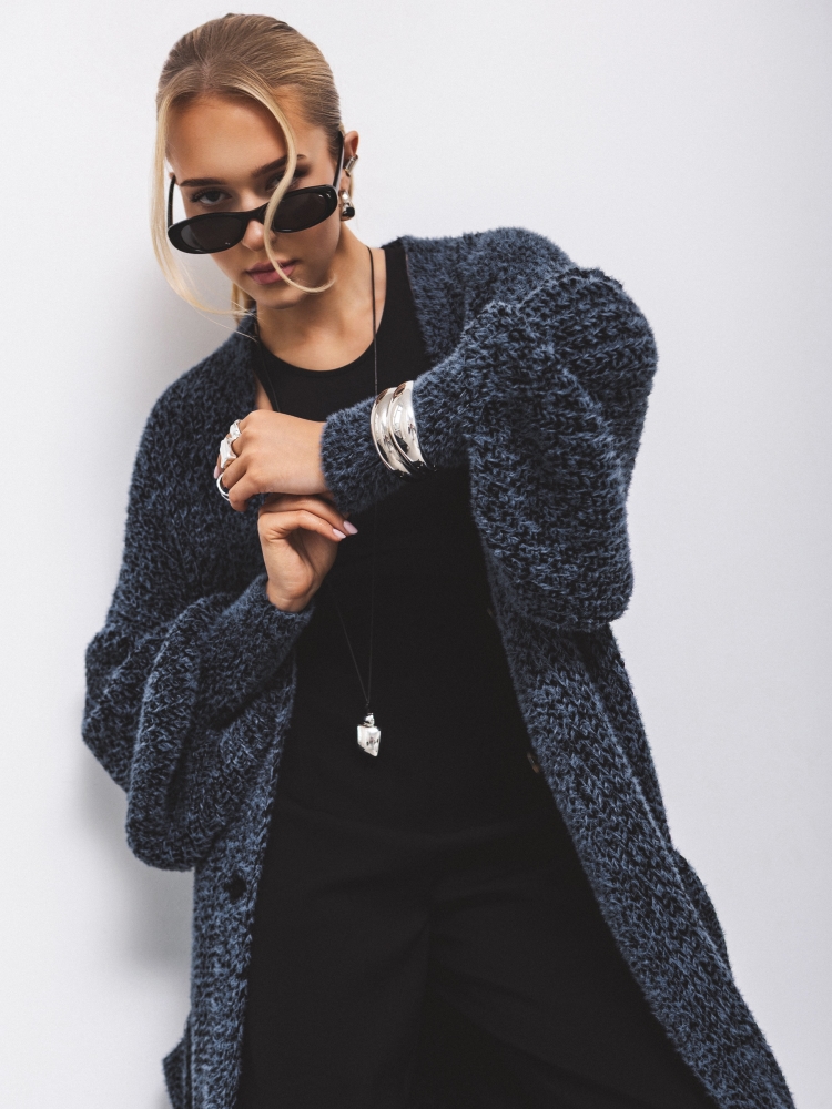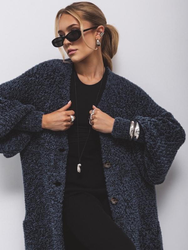 Brilliant, sweater cardigan Lavar Gray, made of colorful yarn. It will perfectly replace both an autumn-winter coat and a classic cardigan. Fastened with wide buttons. An additional advantage is the spacious pockets and puffed sleeves finished with a welt. Maxi length is the latest trend that is conquering the world's catwalks. Made in Poland. Producer Cocomore.