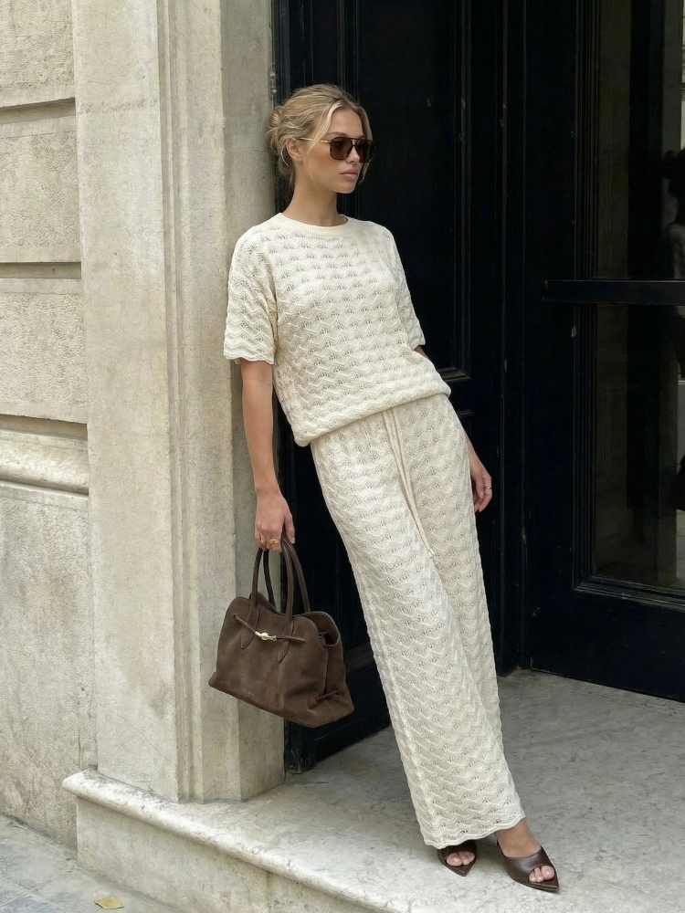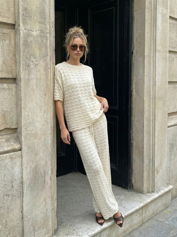 The Lilas sweater is an oversized model made of openwork yarn. It pairs beautifully with the pants of the same name. The sleeves are adorned with irregular trim, adding a touch of charm. Produced by Polish manufacturer Cocomore. Product presentation uses AI visualizations.