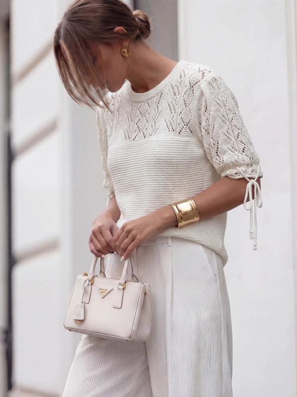 The unique Louie sweater is made of high-quality yarn with unique, openwork patterns. Flared sleeves with tie closures add a touch of elegance. A versatile, unique option for many styles. Made in Poland. Produced by Cocomore. Product presentation uses AI visualizations.