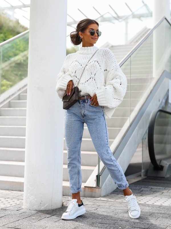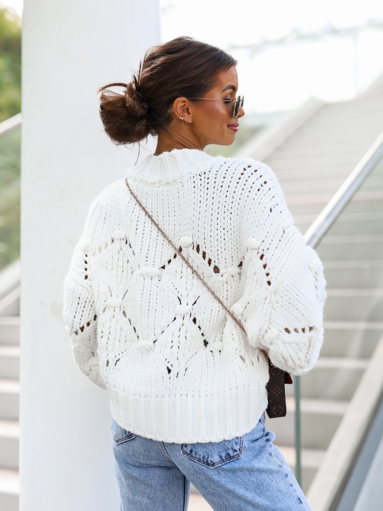 Impressive, oversize Pow sweater in ecru color, made of pleasant to the touch, fleshy yarn that will keep you warm on even the coldest days. On the front there are interesting decorations imitating pompoms. An additional advantage is the fashionable, wide sleeves. Made in Poland. Producer Cocomore.