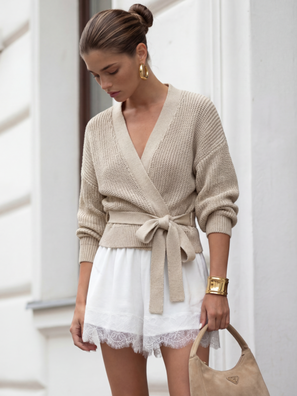 A unique, chunky Rita sweater, tied with a bow at the side. The adjustable, deep V-neck adds a touch of elegance. Wide sleeves with ribbed cuffs add an additional touch. It pairs perfectly with trousers or a flowing skirt. Made in Poland.