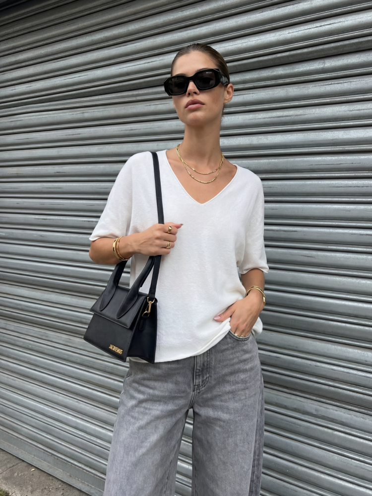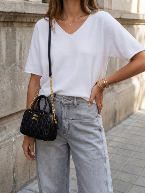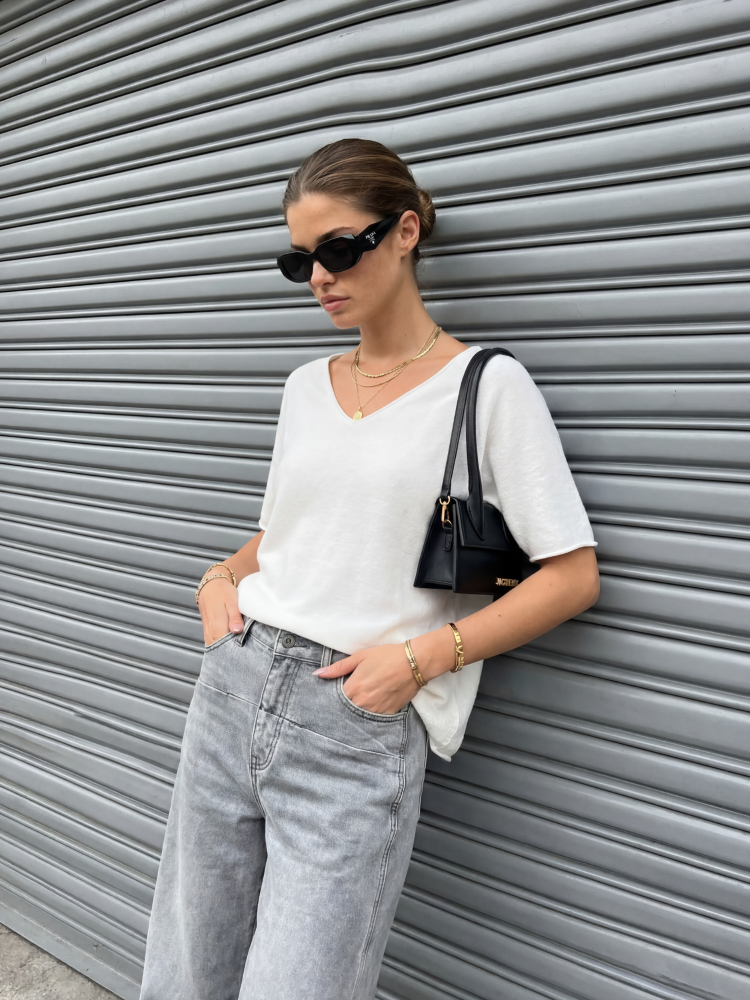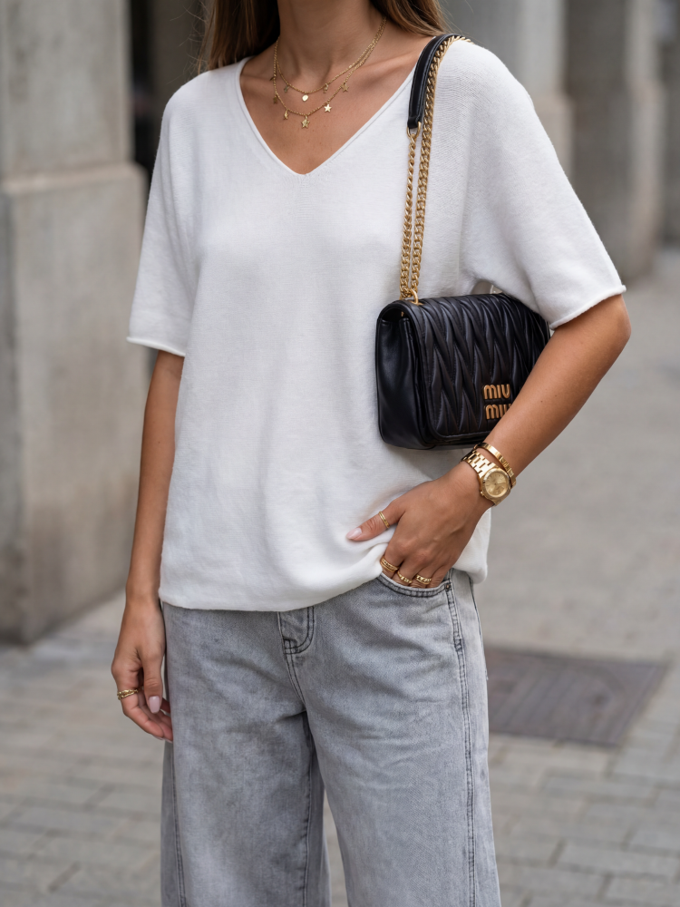 A unique, loose-fitting Sanos sweater, made of high-quality yarn. A feminine V-neckline adds character. It works perfectly as an alternative to a blouse. From the Polish manufacturer Cocomore. The product presentation uses AI visualizations.
