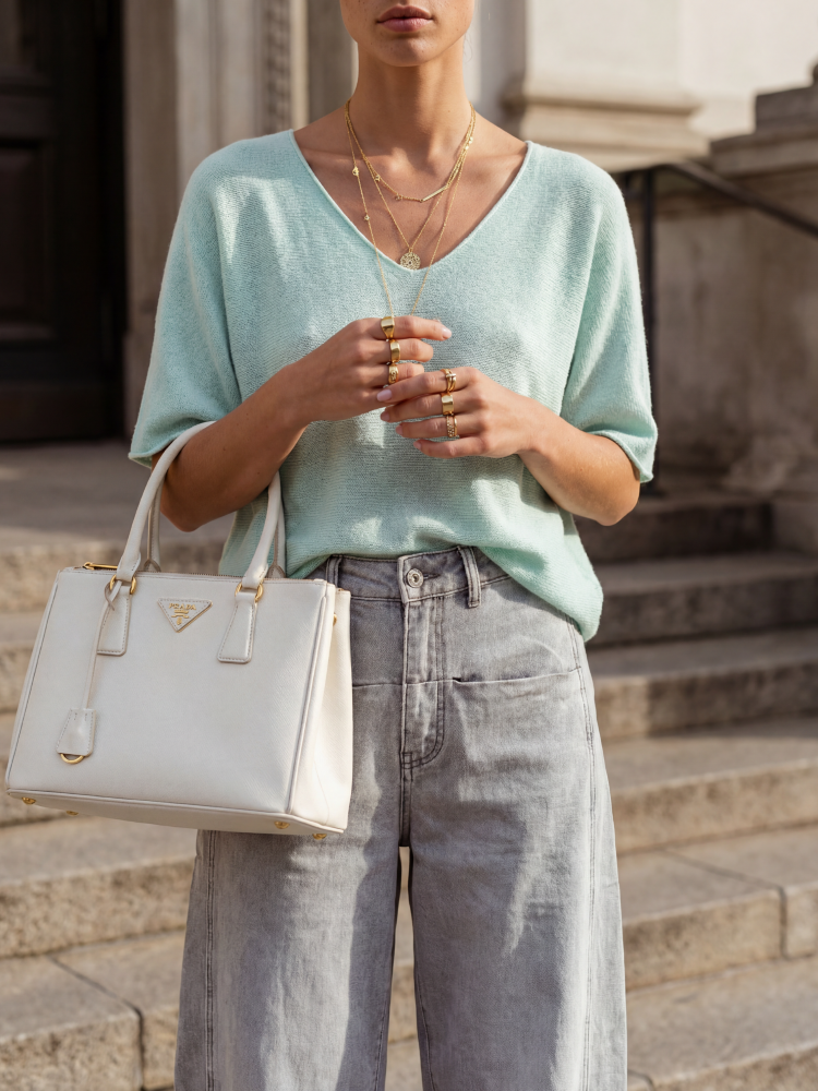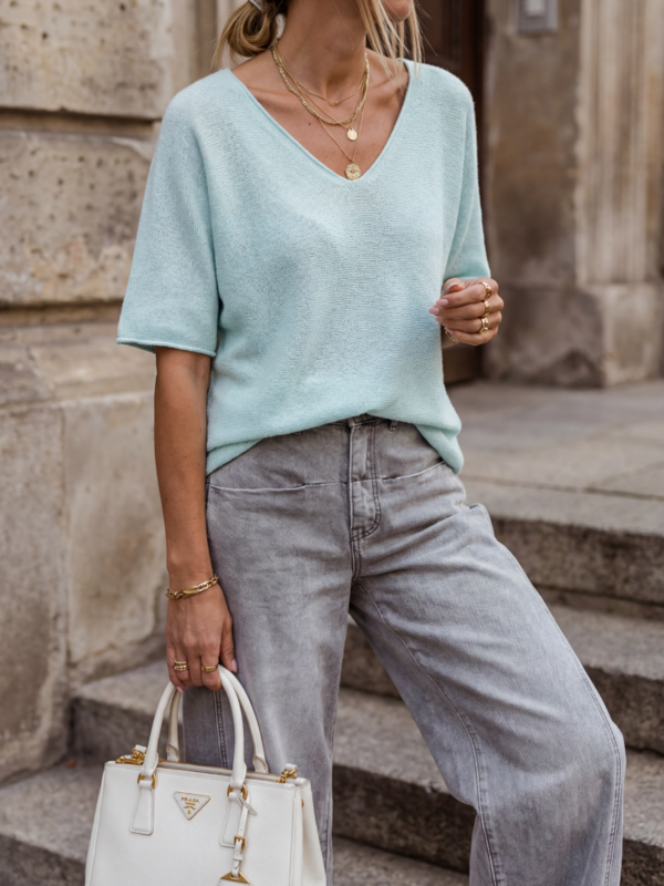 A unique, loose-fitting Sanos sweater, made of high-quality yarn. A feminine V-neckline adds character. It works perfectly as an alternative to a blouse. From the Polish manufacturer Cocomore. The product presentation uses AI visualizations.