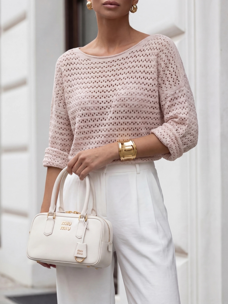 The Zoran sweater features a loose fit and is crafted from high-quality, openwork yarn. Subtle ribbed cuffs ensure a perfect fit. It's a perfect complement to spring and summer outfits. The product presentation utilizes AI visualizations.
