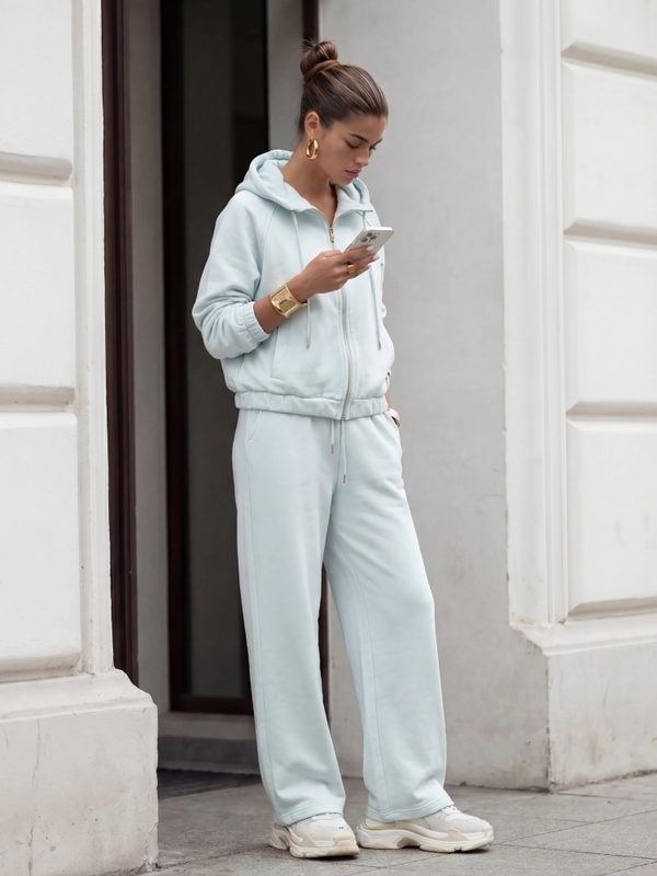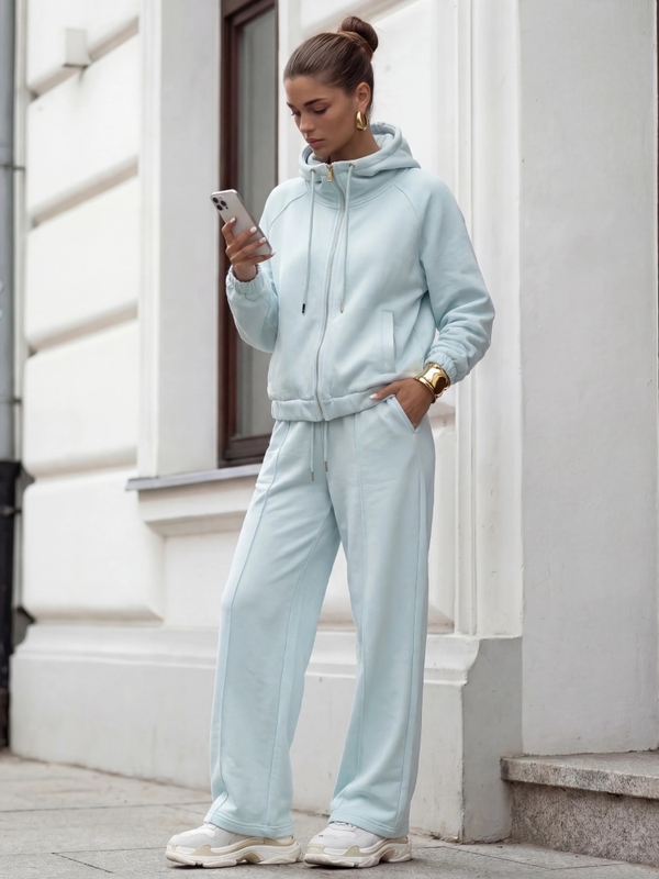 A striking, wide-cut Frankos sweatshirt. Made of high-quality material, it features practical drawstrings at the hem. An additional feature is the wide, fold-over collar that can be tied. Practical pockets are located on the sides. Made in Poland. Manufacturer: Cocomore.  Product presentation uses AI visualizations.