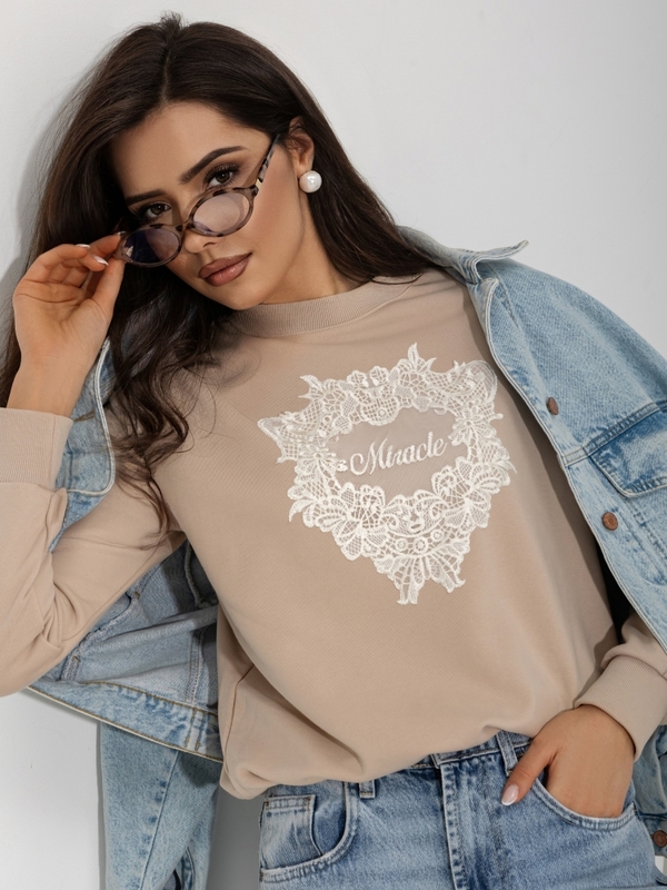 A stylish Wendie sweatshirt, crafted from high-quality fabric. The design is further enhanced by a timeless appliqué adorning the front and a classic collar. Ribbed cuffs add practicality. Perfect for complementing everyday outfits. Produced by Polish company Cocomore.